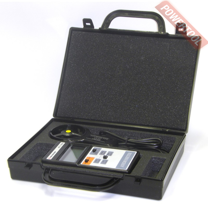 Термоанемометр с крыльчаткой, диапазон измерений скорости 0,8-30 м/с, погрешность 4 процента плюс 0,2 м/с, разрешение 0,1 м/с, диапазон измерений температуры от 0 до 60 градусов С, выбор единиц измерения СИ/USCS, питание от батареи 9 B тип Крона, кейс.