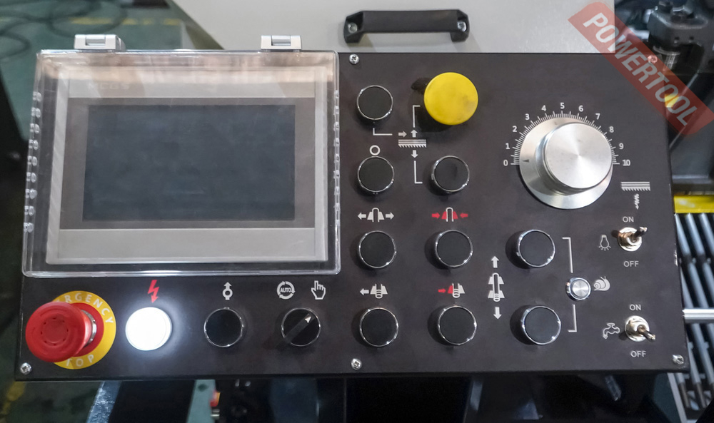 На автоматических станках возможна работа как в ручном режиме, когда каждая операция выполняется вручную посредством нажатия соответствующей кнопки, так и в автоматическом режиме, когда станок выполняет весь цикл резания (зажим заготовки – подвод заготовки – запуск пилы – опускание рамы – остановка пилы – подъем рамы – отжим тисков). В последнем случае оператор должен лишь обеспечить подачу заготовок и нажатие кнопки «Пуск». Станок оснащен гидравлическими тисками. На основной панели расположены: цветной сенсорный дисплей, с помощью которого можно задать программу и отслеживать процесс пиления, регулятор скорости опускания пилы и кнопка аварийного останова.