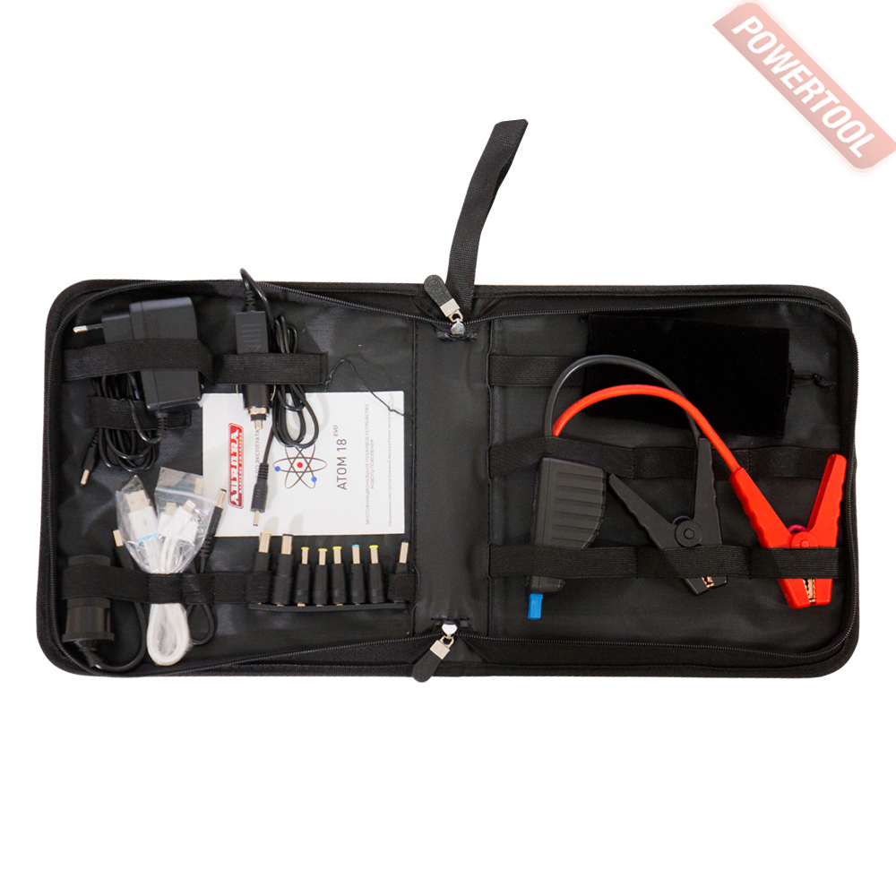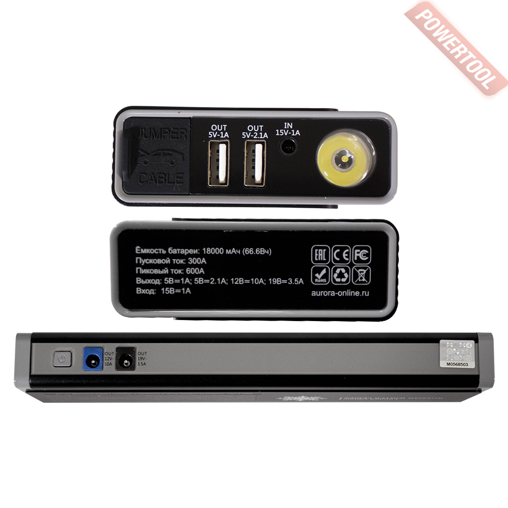 Автономное пусковое устройство для автомобилей с 12 В аккумулятором, пиковый пусковой ток 600 А, рабочий пусковой ток 300 А, внутренний LiPo аккумулятор емкостью 18 Ач, время зарядки 8 ч, напражение сети 220 В, объем двигателя до 4-7 л, функция Power Bank, два USB-выхода 5В/2А, 5В/1А, выход 19В/3,5А для питания ноутбуков, выход 12В/10А для питания автомобильных аксессуаров, разъем зарядки встроенной батареи 15 В/1А, LED фонарь, размеры 224x87x29 мм, вес 0,62 кг, пусковой кабель, сетевой кабель, автомобильная зарядка, адаптер прикуривателя, универсальный USB-кабель, универсальный адаптер для ноутбкука.