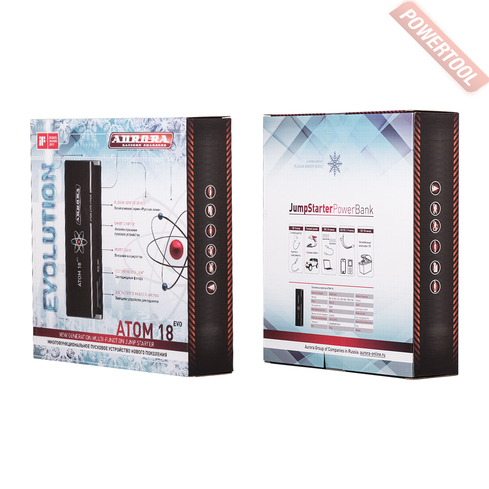 Автономное пусковое устройство AURORA Atom 18 Evolution - специальная серия самых популярных пусковых устройств нового поколения АТОМ 18. На российский рынок новая модель выходит ограниченной серией «РУССКАЯ ЗИМА» (RUSSIAN WINTER SERIES). Предназначено для запуска двигателей мотоциклов, легковых машин, генераторов и прочих устройств для питания которых используется 12В аккумуляторы. Мощности устройства хватит для запуска бензиновых двигателей объёмом 5-7л и для запуска дизельных двигателей до 4л. С помощью АТОМ 18 можно заряжать и питать мобильные телефоны и планшеты, ноутбуки, энергоёмкое автомобильное оборудование (компрессоры, автохолодильники и т.д.). Мощный LED-фонарь поможет осветить место работы в течение нескольких суток. Режим мигания фонаря "SOS" поможет подать сигнал бедствия или предупредит других участников движения в случае неисправности фар. Благодаря малому весу и компактным габаритам ATOM 18 можно использовать в походе, в командировке или на рыбалке.