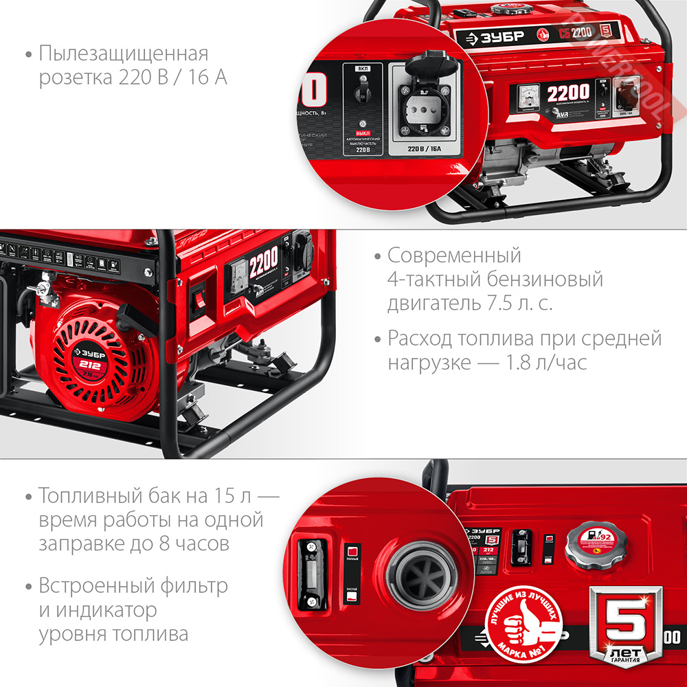 Бензиновый генератор ЗУБР СБ-2200 - компактный генератор увеличенной мощности может обеспечить практически любой потребитель в загородном доме или на природе. Высокий ресурс, низкое потребление топлива и повышенная надежность - основные достоинства генераторов ЗУБР.