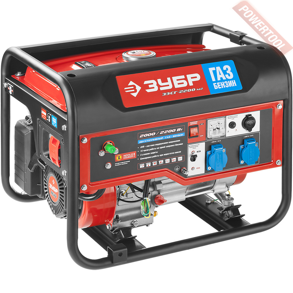 Бензиновый генератор ЗУБР ЗЭСГ-2200-М2 - компактный двухтопливный электрогенератор мощностью 2.2 кВт, работающих как на бензине (АИ-92), так и на газе – при этом, для использования газа не требуется установка дополнительного оборудования. Такой генератор отлично подходит для снабжения маломощных инструментов и оборудования в условиях строительной площадки или автосервиса, а также для обеспечения электричеством небольших дачных домов.
