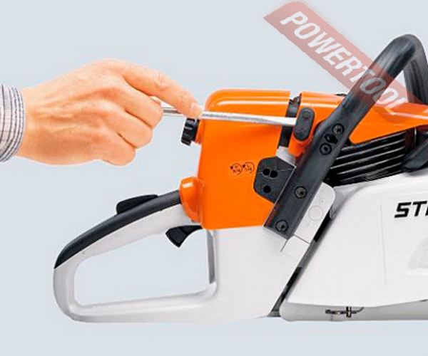 • Система быстрого натяжения цепи (B). Фирменная система быстрого натяжения цепи STIHL (B) превращает натяжение пильной цепи в детскую забаву. Нужно лишь ослабить гайку крепления крышки цепной звёздочки, и с помощью регулировочного колесика легко и быстро натянуть цепь. Инструмент для этого не требуется