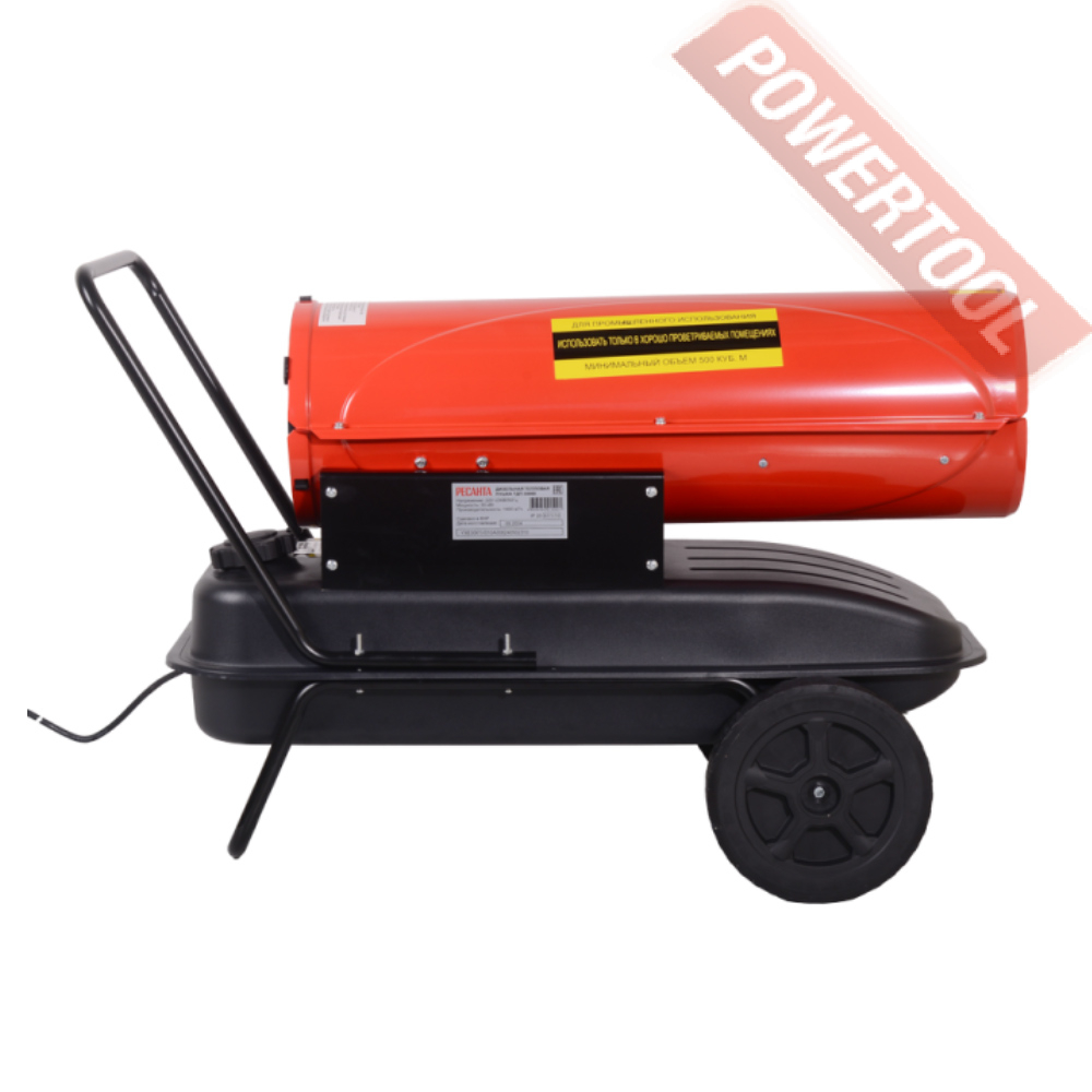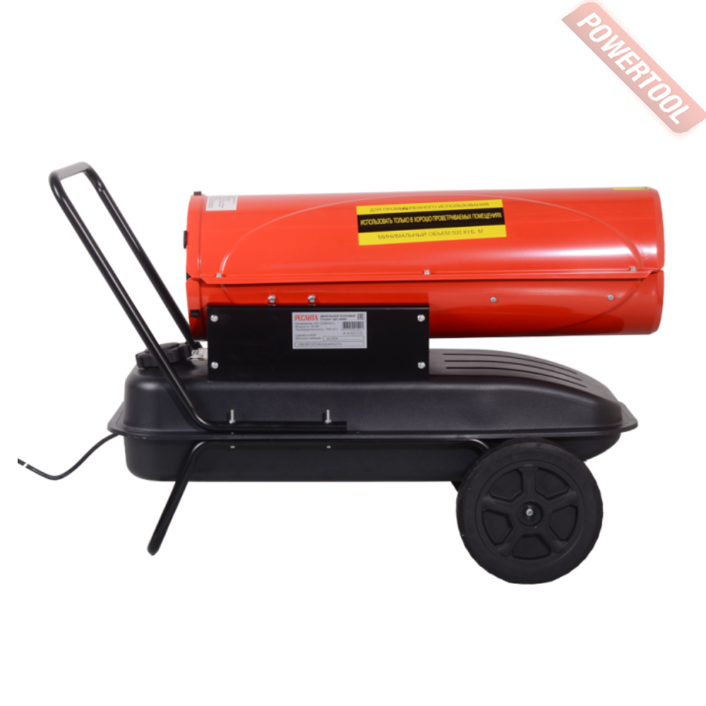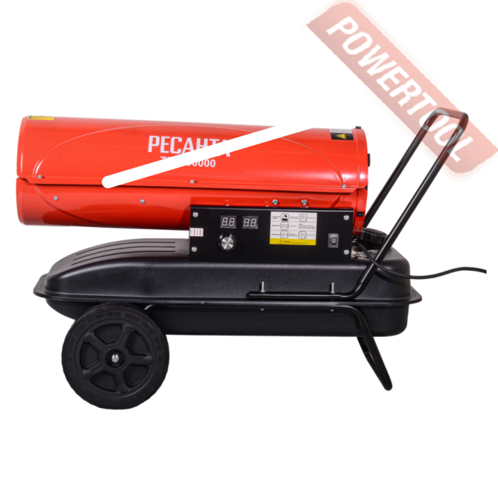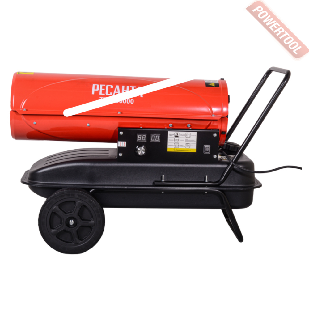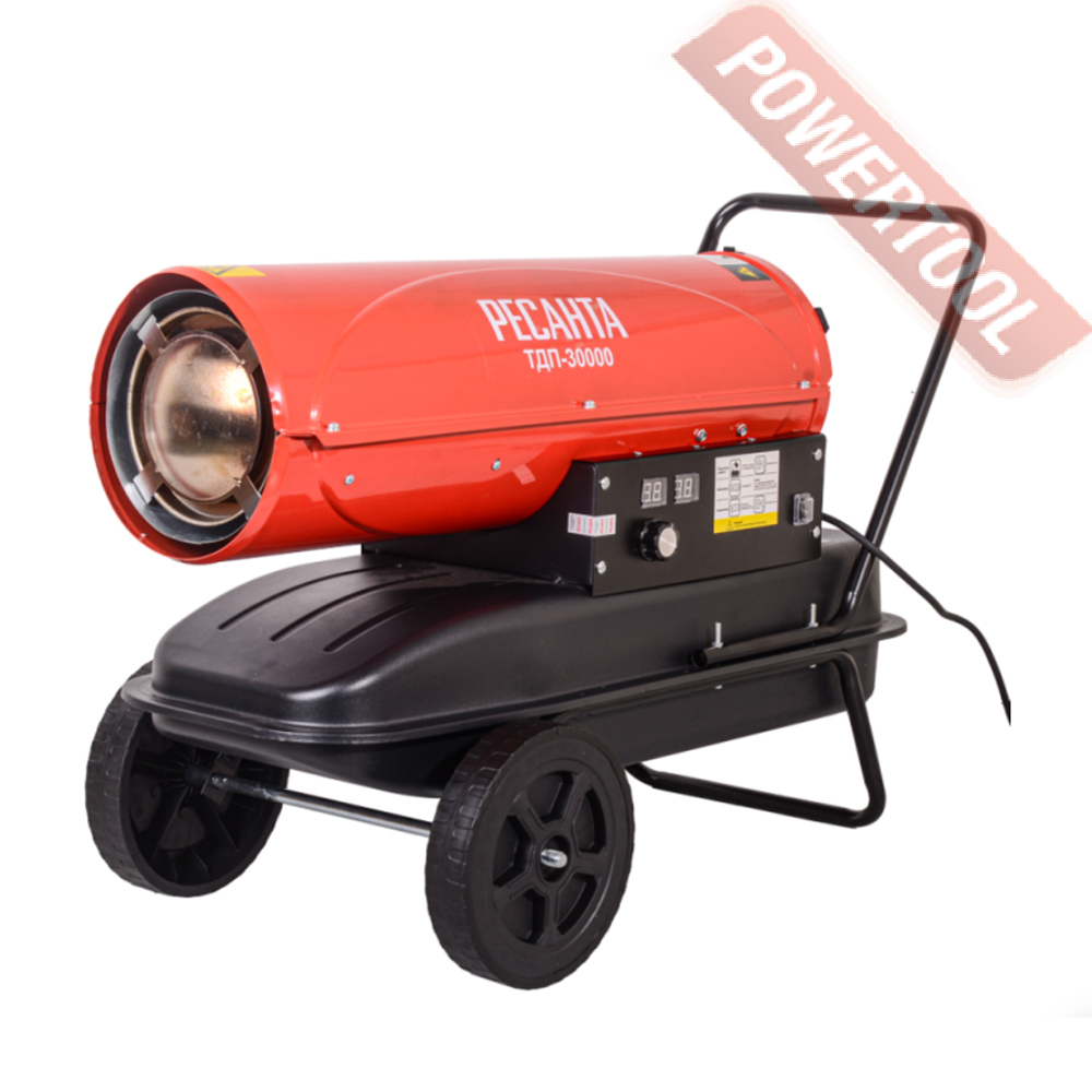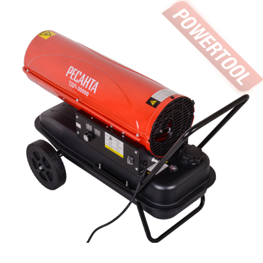 Дизельная тепловая пушка прямого нагрева РЕСАНТА ТДП-30000 может применяться на открытых или хорошо проветриваемых объектах, например, на строительных площадках, заводах, в складских помещениях. Предназначена для высокопроизводительного обогрева нежилых помещений, прогрева бетона или грунта при строительных и ремонтных работах. За короткое время может, обеспечить теплом большое пространство. Открытая камера сгорания выбрасывает вредные продукты вместе с горячим воздухом, поэтому применять в закрытых помещениях с людьми её нельзя. Перемещение и ввод в эксплуатацию не требует особых усилий и знаний. Запуск осуществляется нажатием одной кнопки, после продува системы происходит поджиг и дизельное топливо начинает равномерно сгорать в камере, а вентилятор создает воздушный поток и выдувает теплые массы в окружающее пространство. Уже на первой минуте работы жидкотопливного нагревателя, ощущается высокий КПД системы. Установка этой машины должна происходить в помещениях с возможностью проветривания, давая тем самым выход продуктам сгорания. Так как в технологии изготовления применен процесс прямого нагрева, то вместе с прогретым воздухом из сопла выходят элементы горения. Если нагнетательное давление сбалансировано и форсунка настроена правильно, то выхлопов минимальное количество, копать и темный дым отсутствуют.