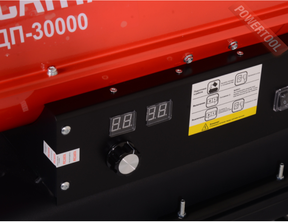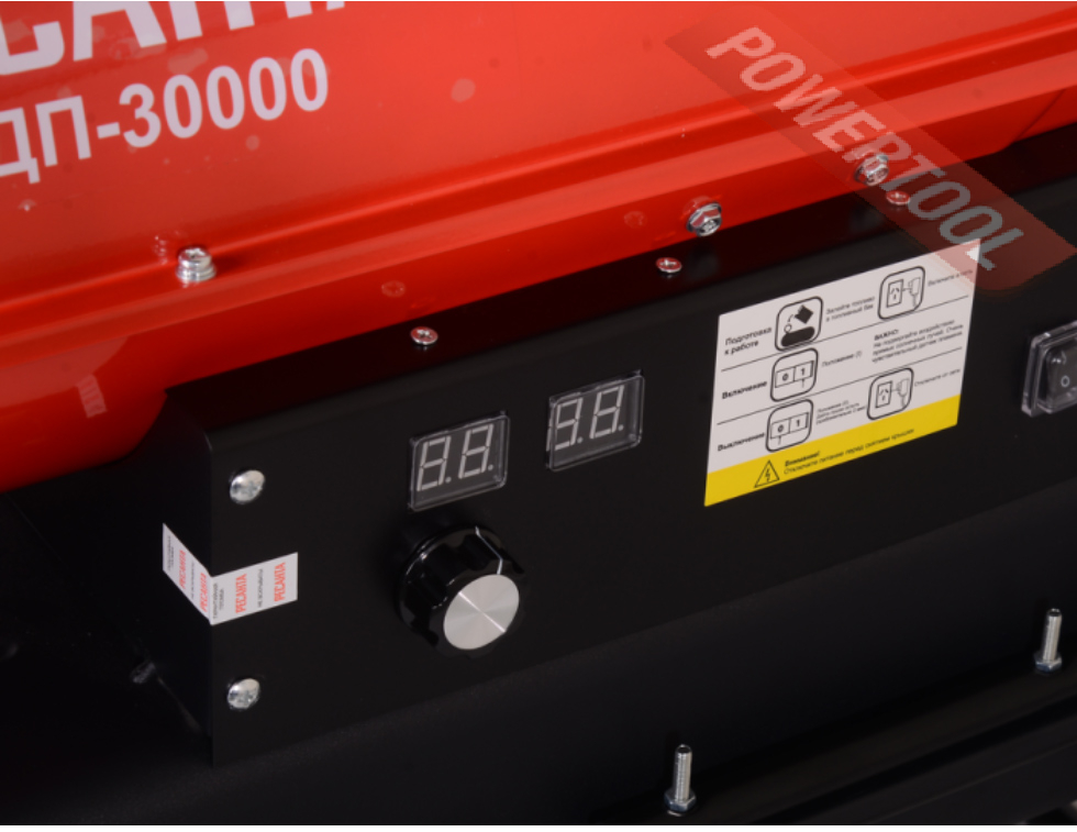 • Тепловая пушка снабжена встроенным термостатом. Термостат автоматически поддерживает заданную температуру воздуха в помещении, автоматически отключая и включая тепловую пушку. Для установки температурного режима есть отдельный переключатель. Рядом с переключателем находится цифровой дисплей, на котором отображается рабочая температура.