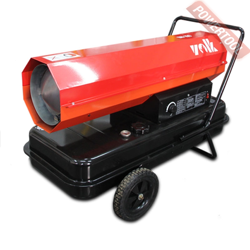 Дизельная тепловая пушка прямого нагрева VOLK DH 150 может применяться на открытых или хорошо проветриваемых объектах, например, на строительных площадках, заводах, в складских помещениях. Предназначена для высокопроизводительного обогрева нежилых помещений, прогрева бетона или грунта при строительных и ремонтных работах. За короткое время может, обеспечить теплом большое пространство. Открытая камера сгорания выбрасывает вредные продукты вместе с горячим воздухом, поэтому применять в закрытых помещениях с людьми её нельзя. Перемещение и ввод в эксплуатацию не требует особых усилий и знаний. Запуск осуществляется нажатием одной кнопки, после продува системы происходит поджиг и дизельное топливо начинает равномерно сгорать в камере, а вентилятор создает воздушный поток и выдувает теплые массы в окружающее пространство. Уже на первой минуте работы жидкотопливного нагревателя, ощущается высокий КПД системы. Установка этой машины должна происходить в помещениях с возможностью проветривания, давая тем самым выход продуктам сгорания. Так как в технологии изготовления применен процесс прямого нагрева, то вместе с прогретым воздухом из сопла выходят элементы горения. Если нагнетательное давление сбалансировано и форсунка настроена правильно, то выхлопов минимальное количество, копать и темный дым отсутствуют.