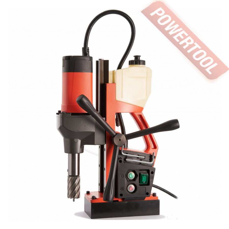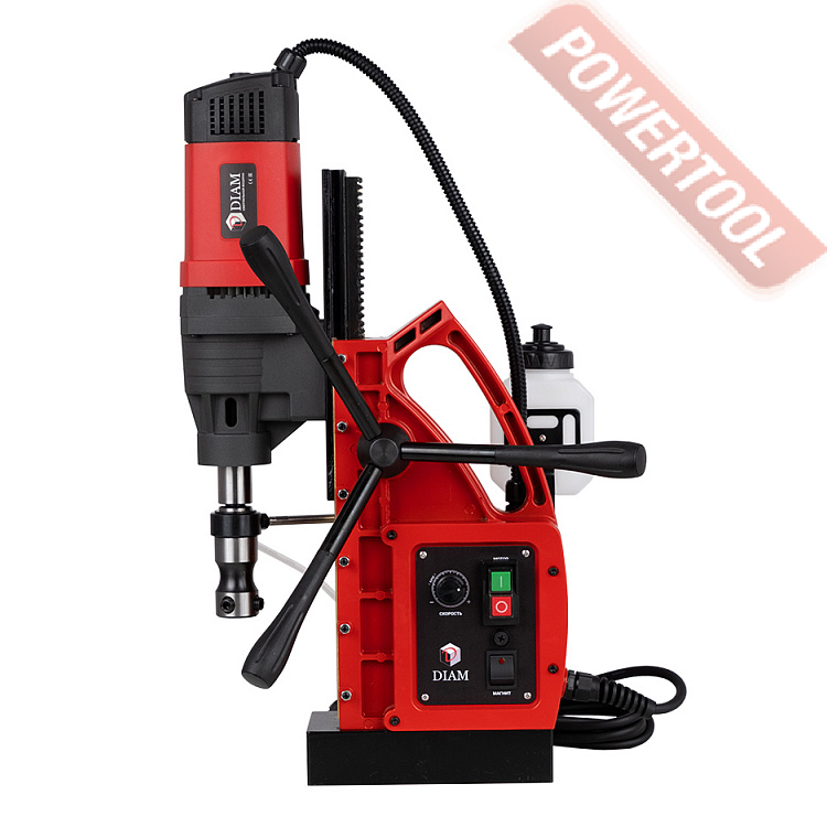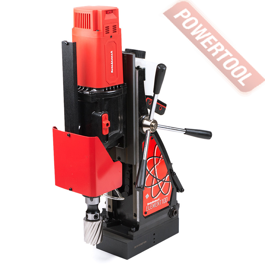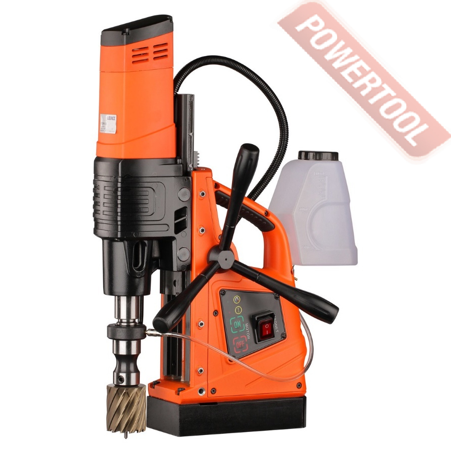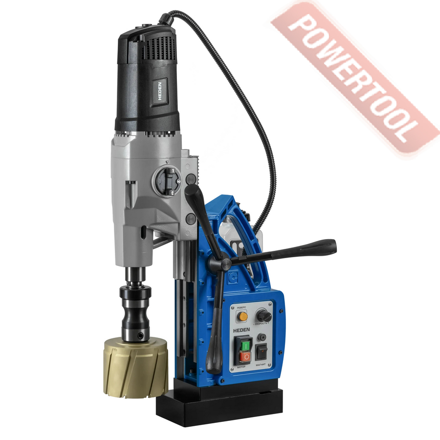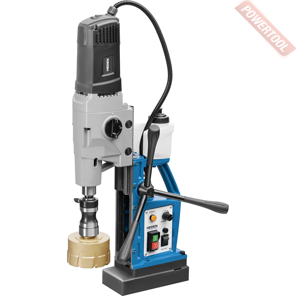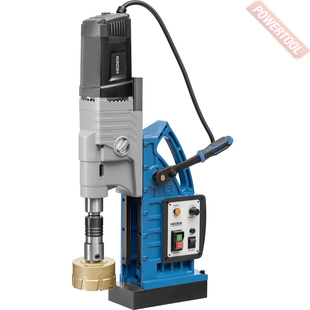 - Мощность 1200 Вт двигателя, передаваемая через трехступенчатый редуктор, позволяет сверлить с помощью коронок отверстия диаметром до 42 мм в стальных изделиях толщиной до 50 мм.