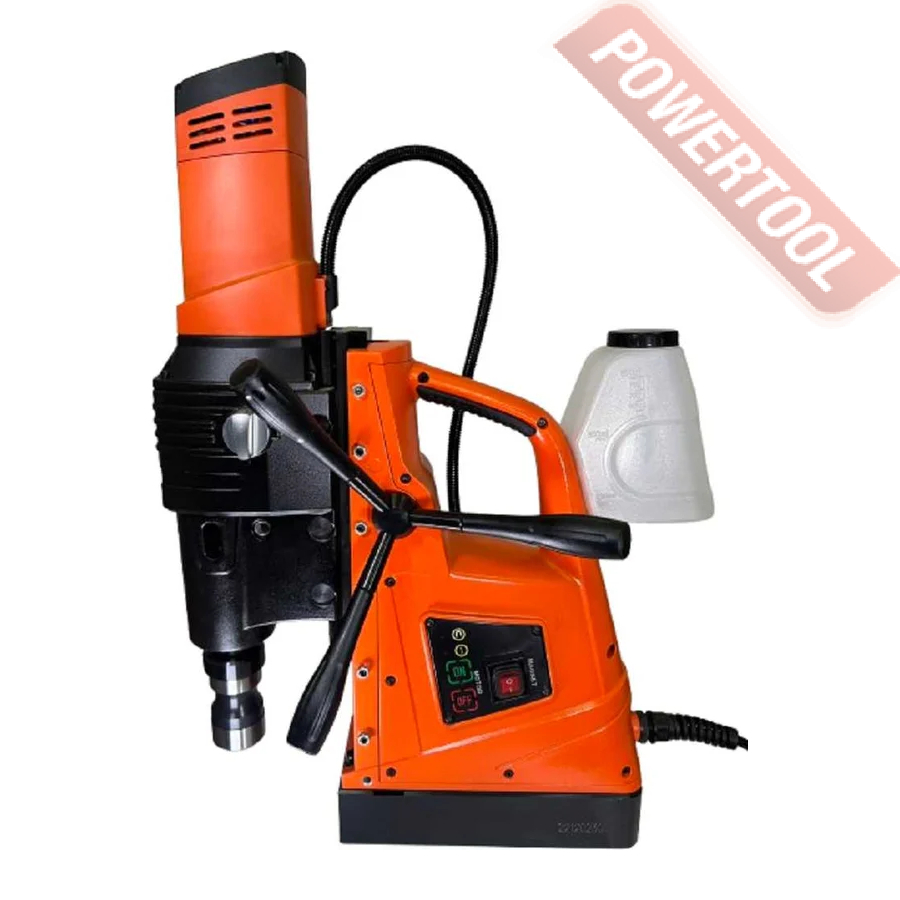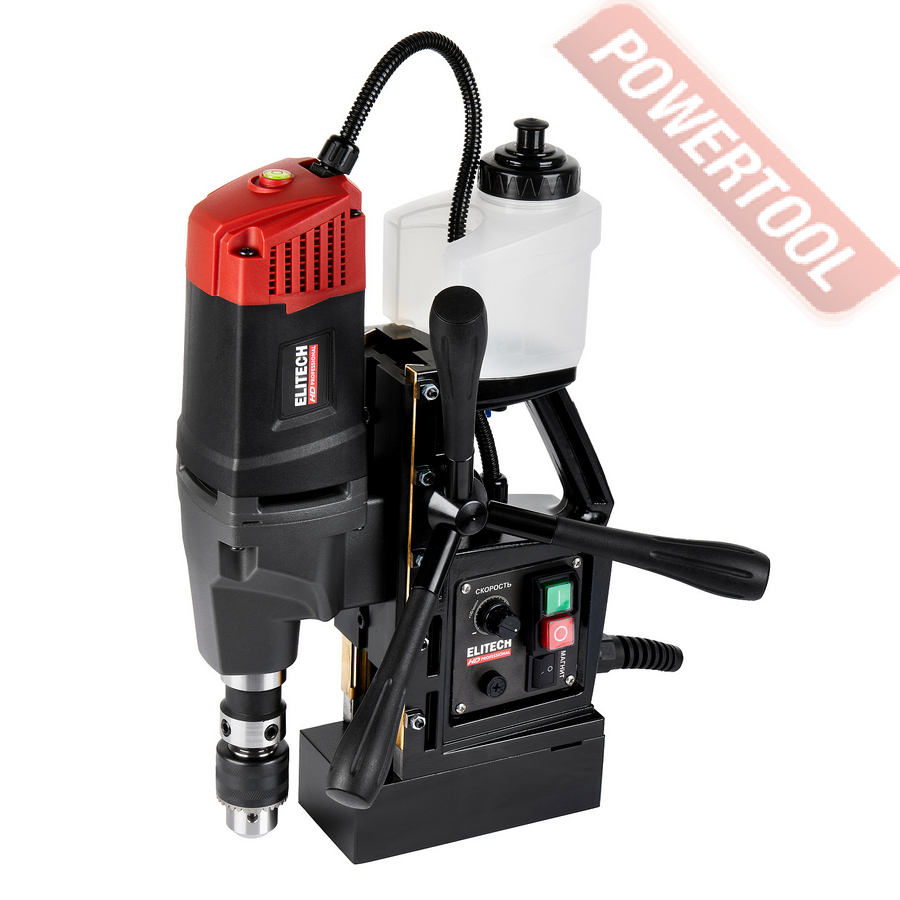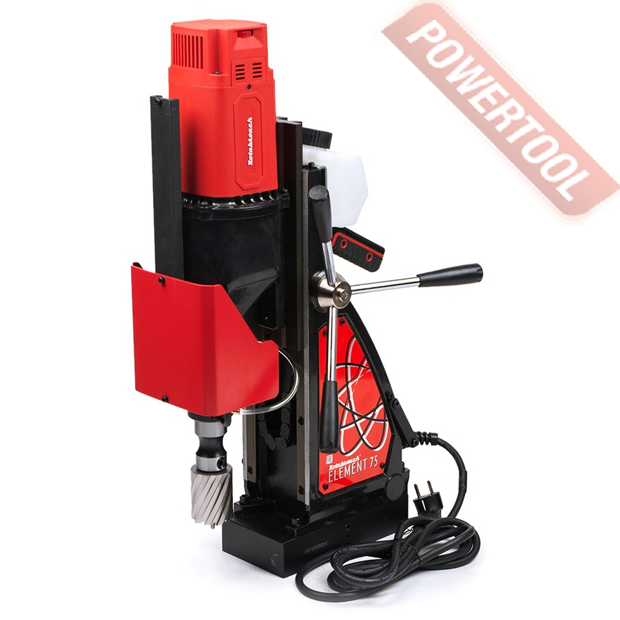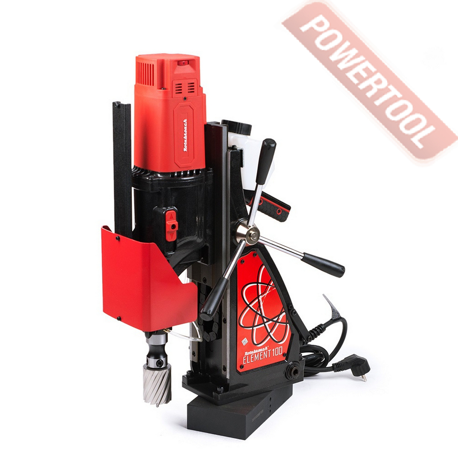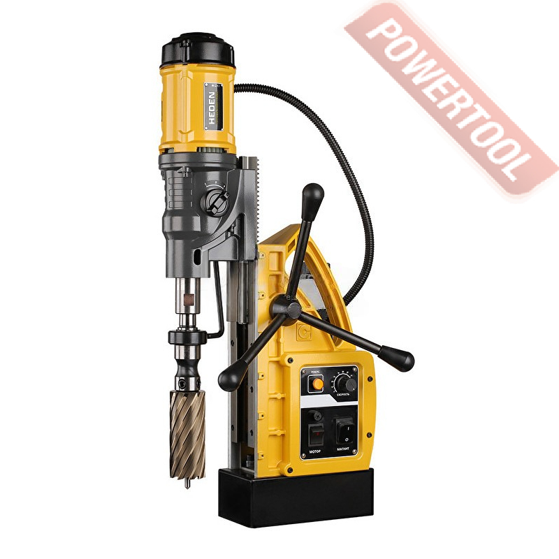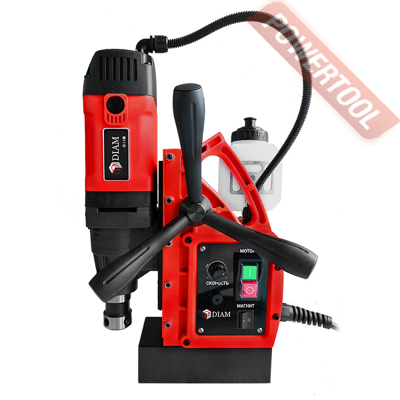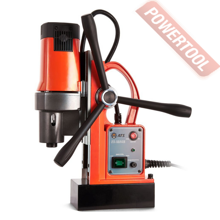 - Мощность 1200 Вт двигателя, передаваемая через трехступенчатый редуктор, позволяет сверлить с помощью коронок отверстия диаметром до 42 мм в стальных изделиях толщиной до 50 мм.