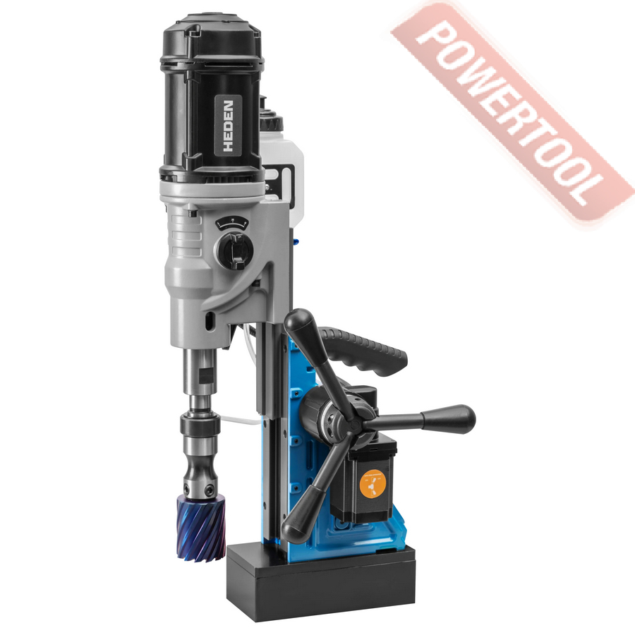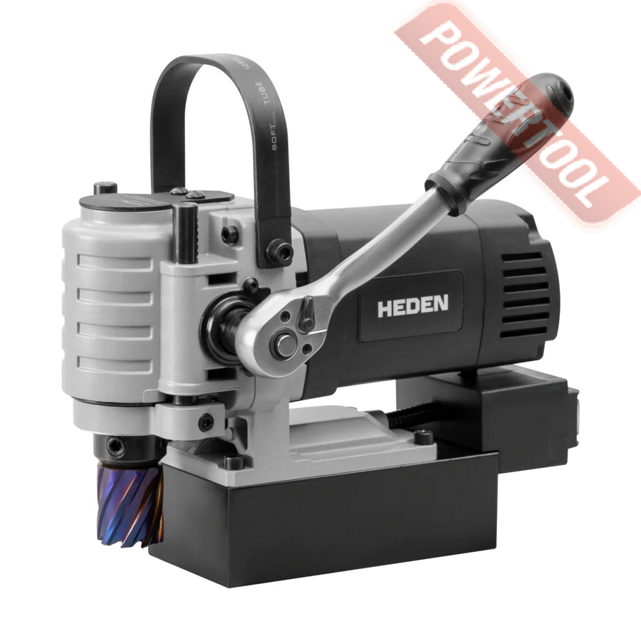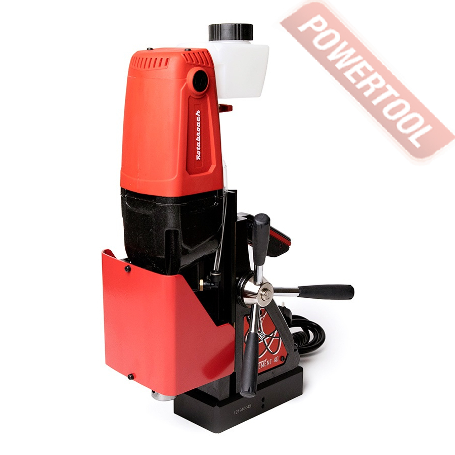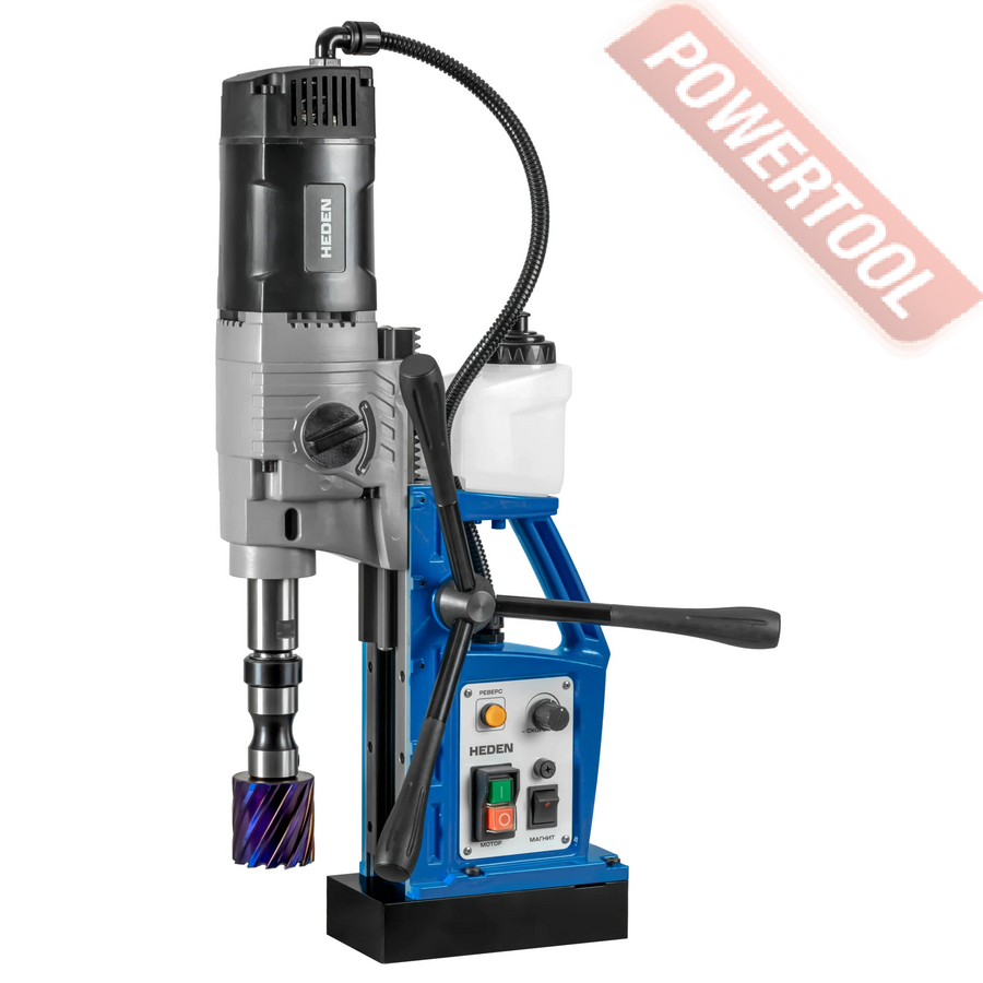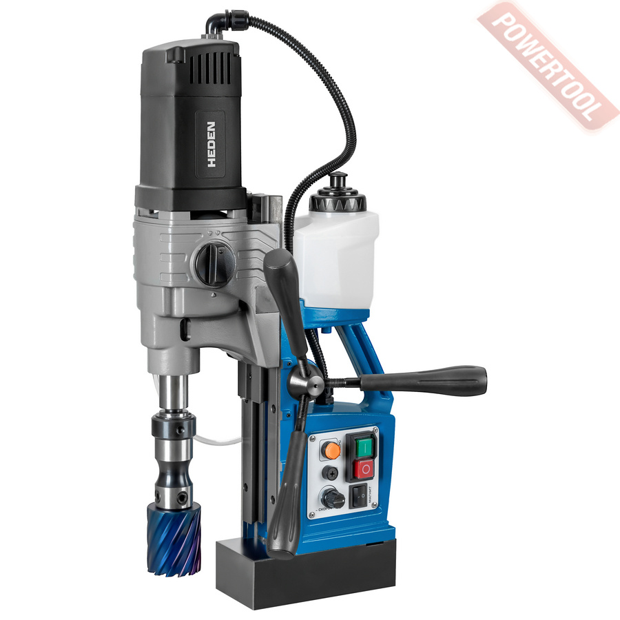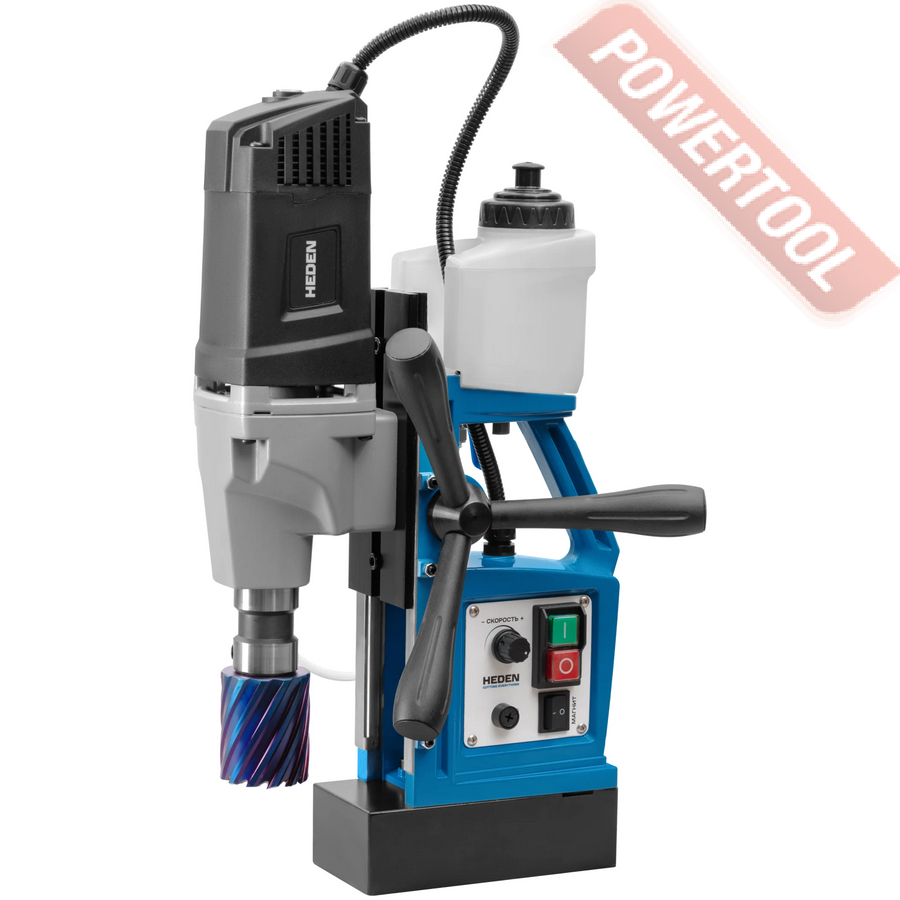 - Мощность 1200 Вт двигателя, передаваемая через трехступенчатый редуктор, позволяет сверлить с помощью коронок отверстия диаметром до 42 мм в стальных изделиях толщиной до 50 мм.