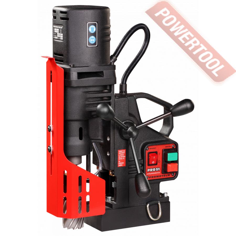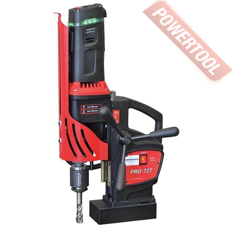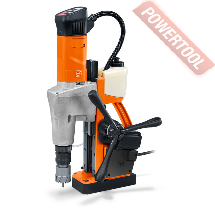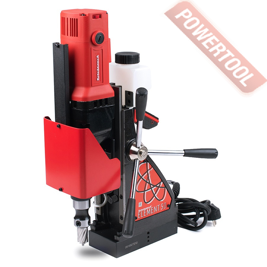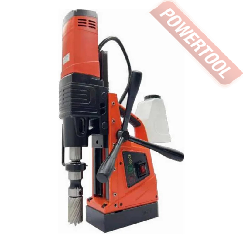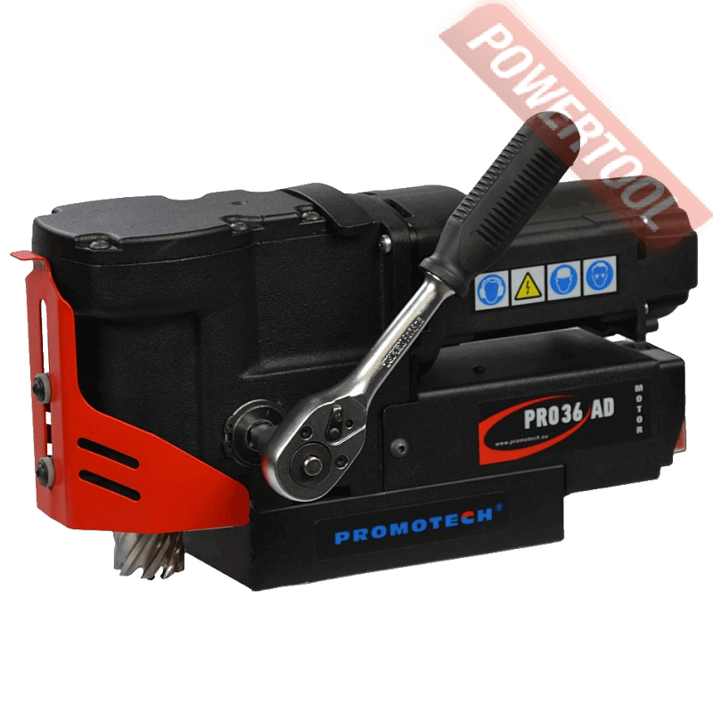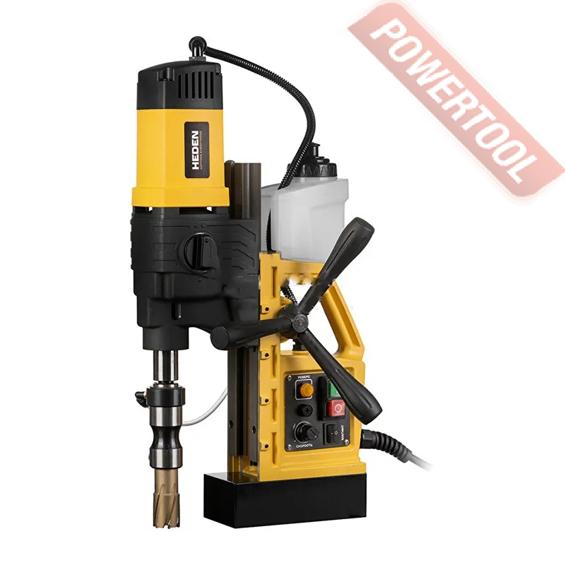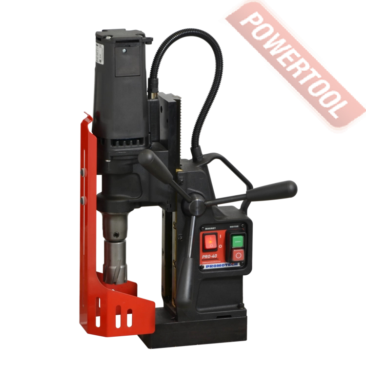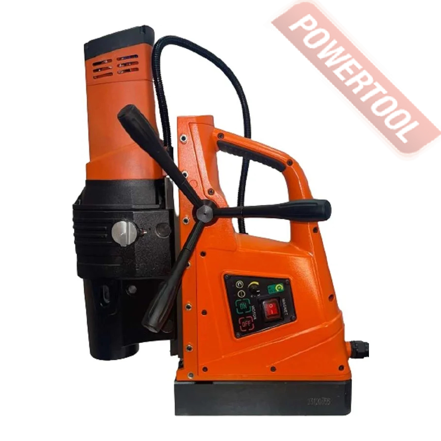 - Мощность 1200 Вт двигателя, передаваемая через трехступенчатый редуктор, позволяет сверлить с помощью коронок отверстия диаметром до 42 мм в стальных изделиях толщиной до 50 мм.
