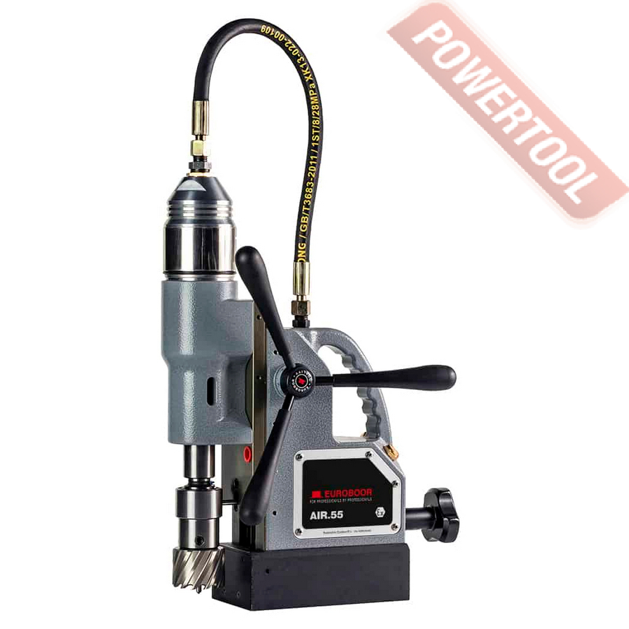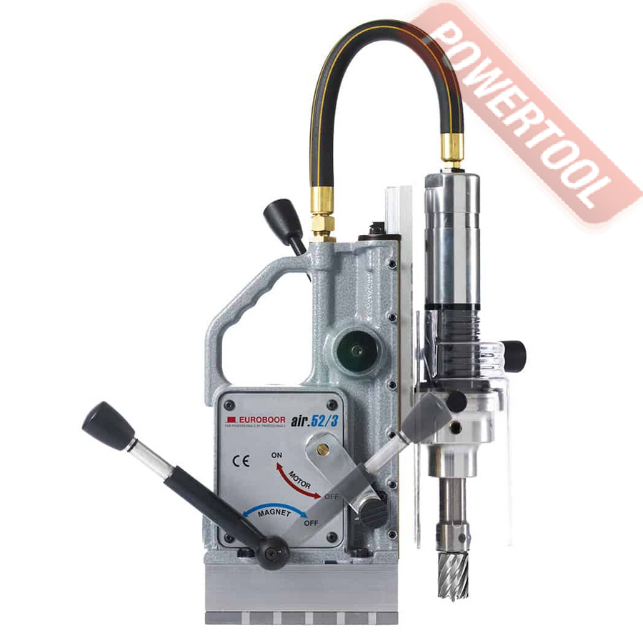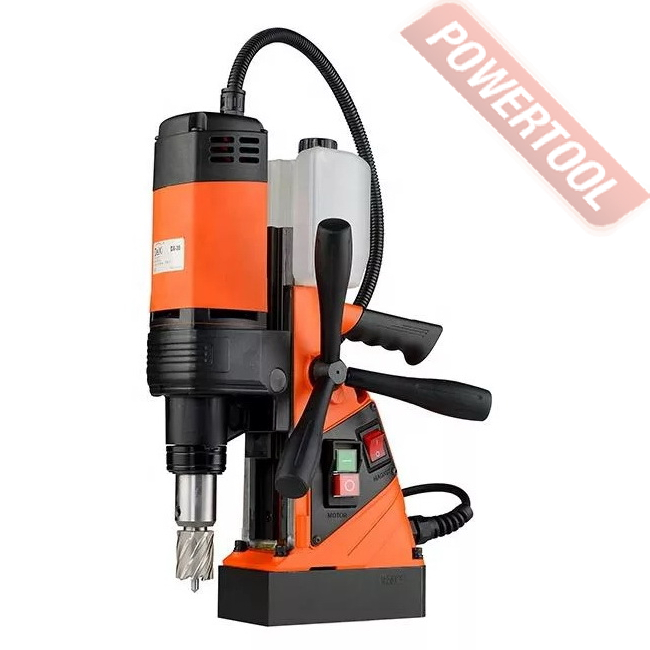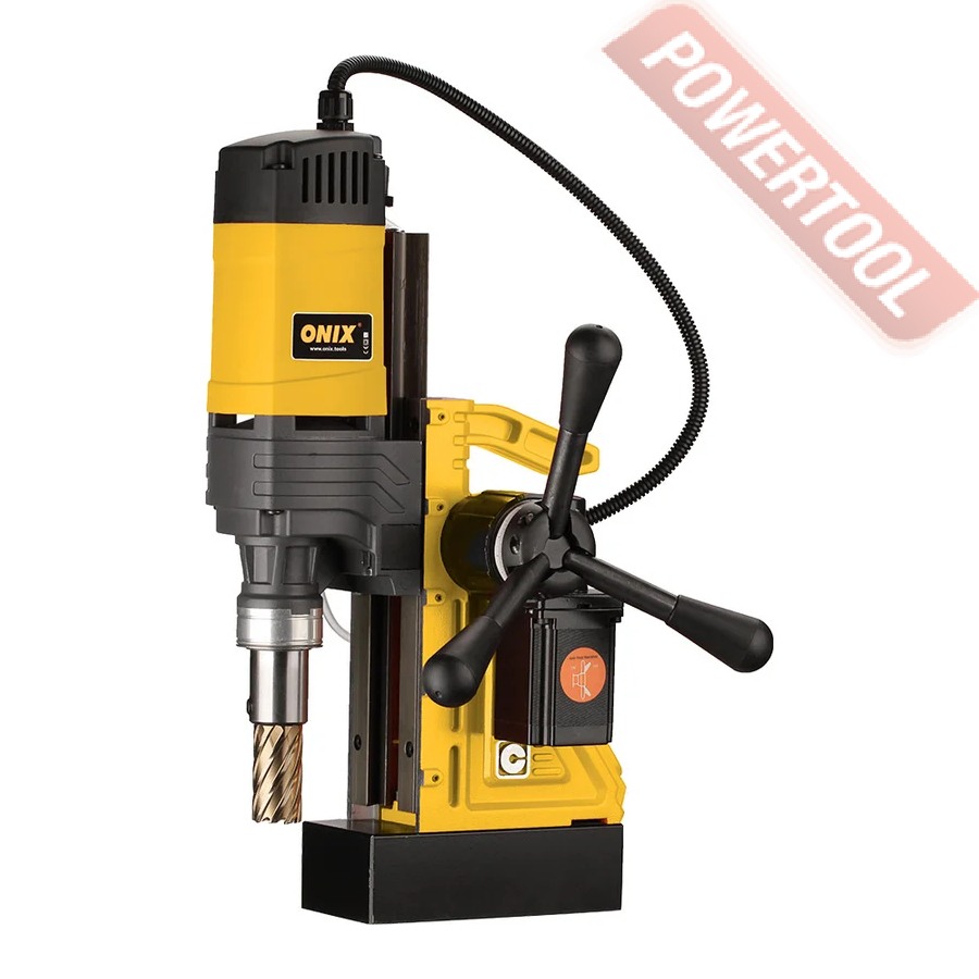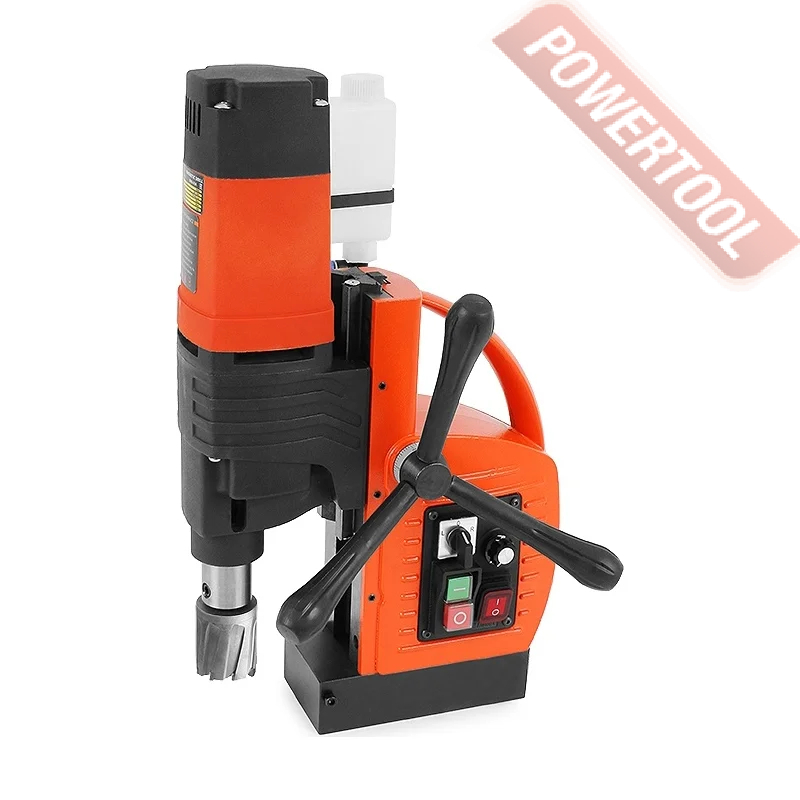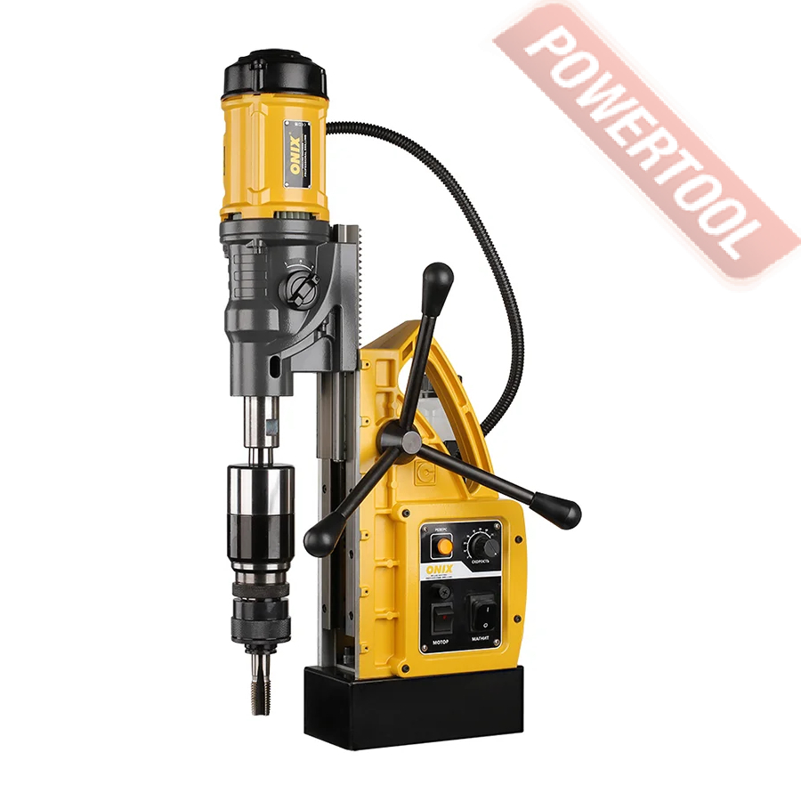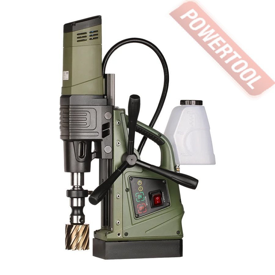 - Мощность 1200 Вт двигателя, передаваемая через трехступенчатый редуктор, позволяет сверлить с помощью коронок отверстия диаметром до 42 мм в стальных изделиях толщиной до 50 мм.