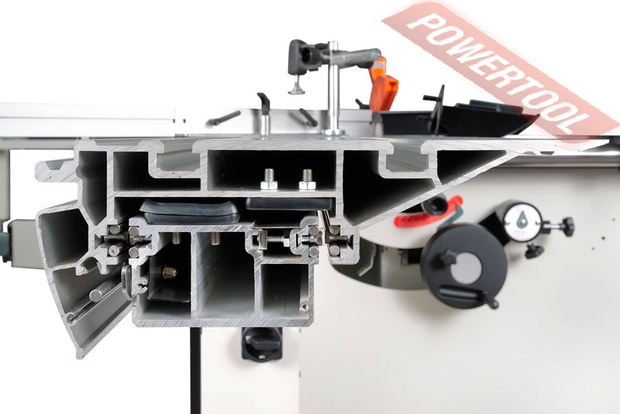 Основной рабочий стол из чугунного литья дополнен съёмными расширением и удлинением. Параллельный упор установлен на 55-миллиметровой цилиндрической направляющей и имеет эксцентриковый механизм фиксации. Высокая жёсткость и прочность конструкции соответствует стандартам промышленного оборудования, пригодного для каждодневной интенсивной эксплуатации.