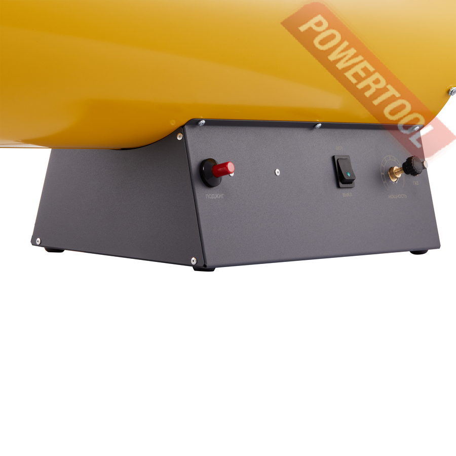 Тепловая газовая пушка, топливо: сжиженный газ (пропан/пропан-бутан/бутан), напряжение сети 220 В, тепловая мощность 22,4-53 кВт, расход воздуха 1000 куб.м/ч, расход сжиженного газа 4-4,4 кг/ч, потребляемая мощность 103 Вт, регулировка мощности, контроль пламени, датчик перегрева, габариты 710х270х415 мм, вес 11,7 кг, газовый шланг 2 м, редуктор.