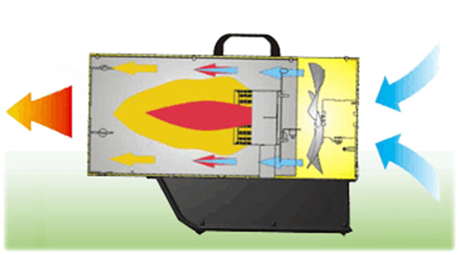 - Нагнетательный осевой вентилятор. Он создает воздушный поток, который выходит через рабочее сопло уже нагретый в теплообменнике прямого типа. Работает от сети 220 В потребляя немного энергии. Электродвигатель вентилятора имеет защиту от перегрева и скачков напряжения сети.