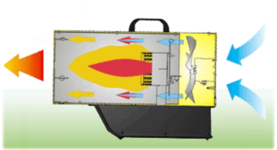 - Нагнетательный осевой вентилятор. Он создает воздушный поток, который выходит через рабочее сопло уже нагретый в теплообменнике прямого типа. Работает от сети 220 В потребляя немного энергии. Электродвигатель вентилятора имеет защиту от перегрева и скачков напряжения сети.