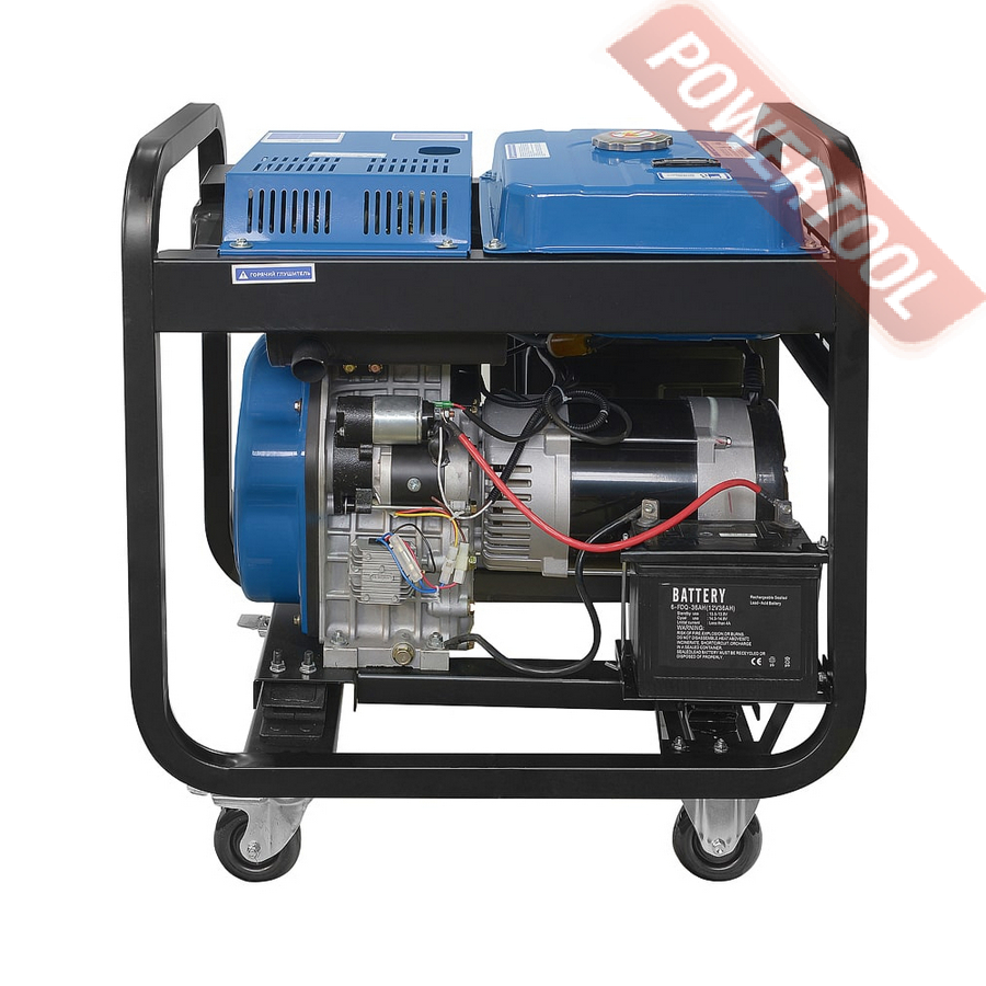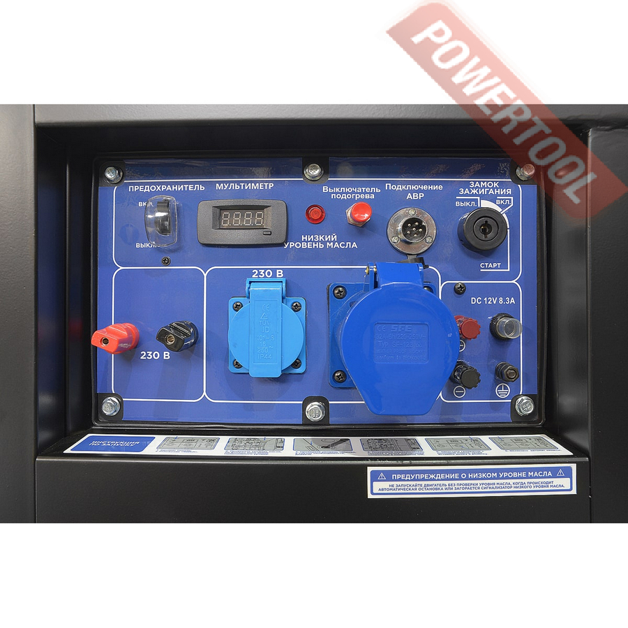 Электростанция дизельная однофазная 220 В, максимальная мощность 8,5 кВт, номинальный ток 34,8 А, 4-тактный дизельный двигатель LT1100FE объемом 667 куб.см и мощностью 13,6 л.с. с электростартером, топливный бак 25 л, расход топлива 2,1 л/ч, емкость картера 1,6 л, 1 розетка 220В/16A, 1 розетка 220В/32A, выход 12 В, время работы без дозаправки топлива 11 ч, разъем для для подключения блока автоматики, автоматическая регулировка напряжения AVR, цифровой дисплей, предпусковой подогреватель, счетчик моточасов, датчик низкого уровня масла, открытый кожух, размеры 780х585х700 мм, вес 145 кг, колеса, аккумулятор.