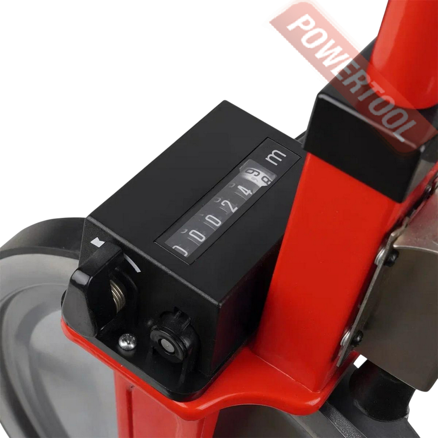 Измерительное дорожное колесо, диаметр колеса 318 мм, длина окружности 1000 мм, шаг измерения 10 см, мах расстояние 9999,9 м, кнопка сброса и тормоза находится на складной ручке, подложка, питание от 2х батареек типа ААА, вес 4,8 кг.