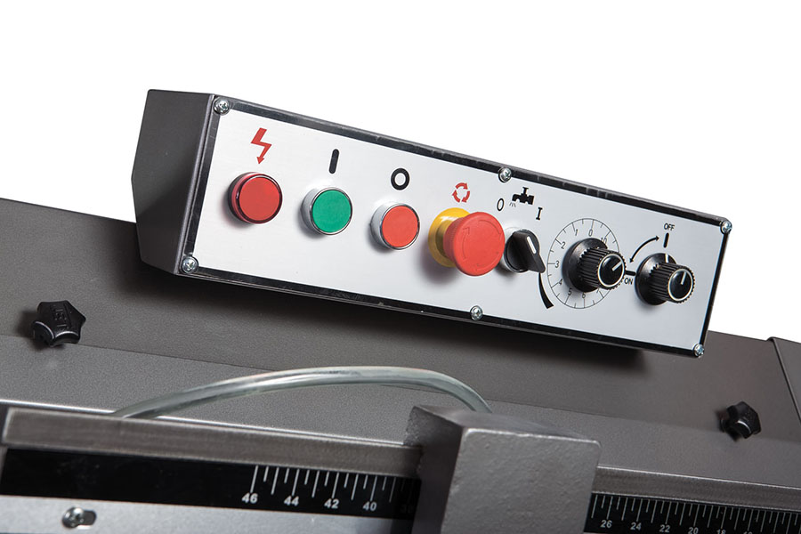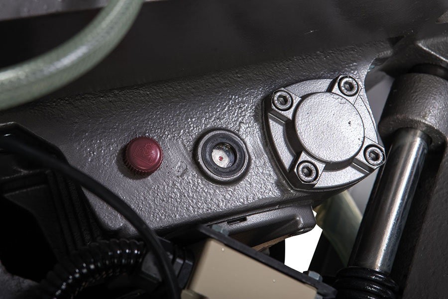 - Гидравлическая система подачи, автоматическое плавное опускание консоли. Регулирует скорость опускания пильной рамы, что в свою очередь позволяет максимально точно регулировать режим работы с заготовкой для достижения наилучшего результата.