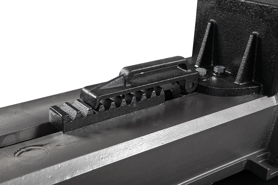 - Быстропереставляемая губка тисков. Тиски могут быть переставлены для резов под углом и резов со скосом. Ослабьте винты и зажмите стационарную губку в положении с желаемым углом. Ослабьте винт с шестигранной головкой и установите зажимную губку параллельно к стационарной губке. С помощью угломера проверьте дополнительно правильность установки угла.