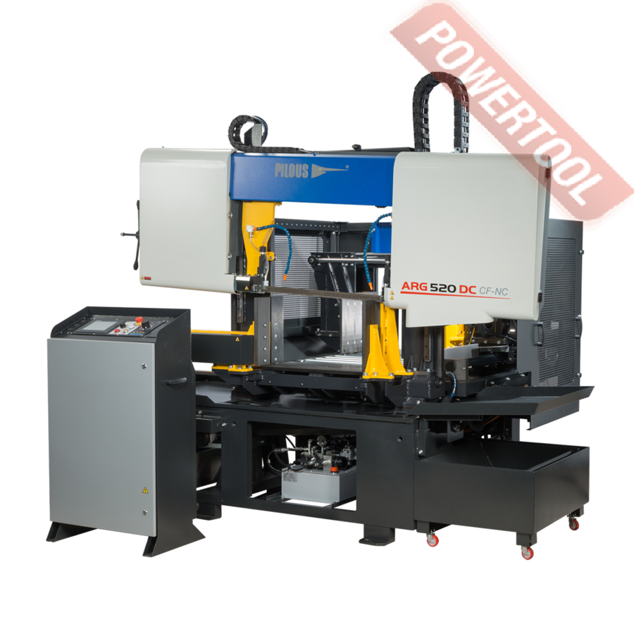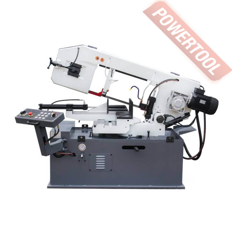 - Автоматический ленточнопильный станок. Станок оборудован высокопроизводительным промышленным гидроагрегатом. Полный цикл пиления запускается при нажатии одной кнопки - происходит зажим материала, подача заготовки в зону реза, включение вращения пилы и подачи СОЖ, распила, выключения пилы и СОЖ, подъем рамы в исходное настраиваемое положение и разжим тисков. Все это, при наличии управляемой гидравлической подачи, позволяет получить максимальную производительность, особенно при пилении больших серий и пилении труднообрабатываемых материалов сплошного сечения. При переключении в ручной режим, можно управлять всеми функциями станка по отдельности.