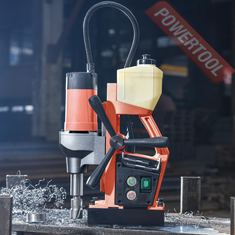 Магнитный сверлильный станок AT-S SU-36 рассчитан для сверлильных работ в металле с применением корончатых сверл длиной до 110 мм и диаметром до 36 мм со стандартным хвостовиком WELDON1 9 мм, а также спиральных сверл с цилиндрическим хвостовиком диаметром до 16 мм (трехкулачковый патрон поставляется в комплекте). Эргономичная форма станины с ребрами жесткости имеет очень удобный хват, новое поколение ручек передвижения привода, небольшой бачок для подвода охлаждения с воздушным клапаном для экономии СОЖ. Встроенная система охлаждения позволяет поступать СОЖ изнутри в место сверления и эффективно охлаждать корончатое сверло и металл. Панель управления станком с утопленными внутрь кнопками защищает их от случайного нажатия и повреждения, а также имеет отсек для хранения 2-х шестигранных ключей, которые всегда под рукой и не потеряются. Вертикальное положение шпинделя при необходимости можно поднять вверх до 280 мм от основания магнита для установки дополнительной оснастки или опустить ниже магнитного основания на 25 мм, за счет дополнительного крепления привода на направляющей двумя винтами под шестигранник. Рекомендуем данный станок к использованию для высотных работ, на небольших производствах, в специализированных цехах металлообработки.