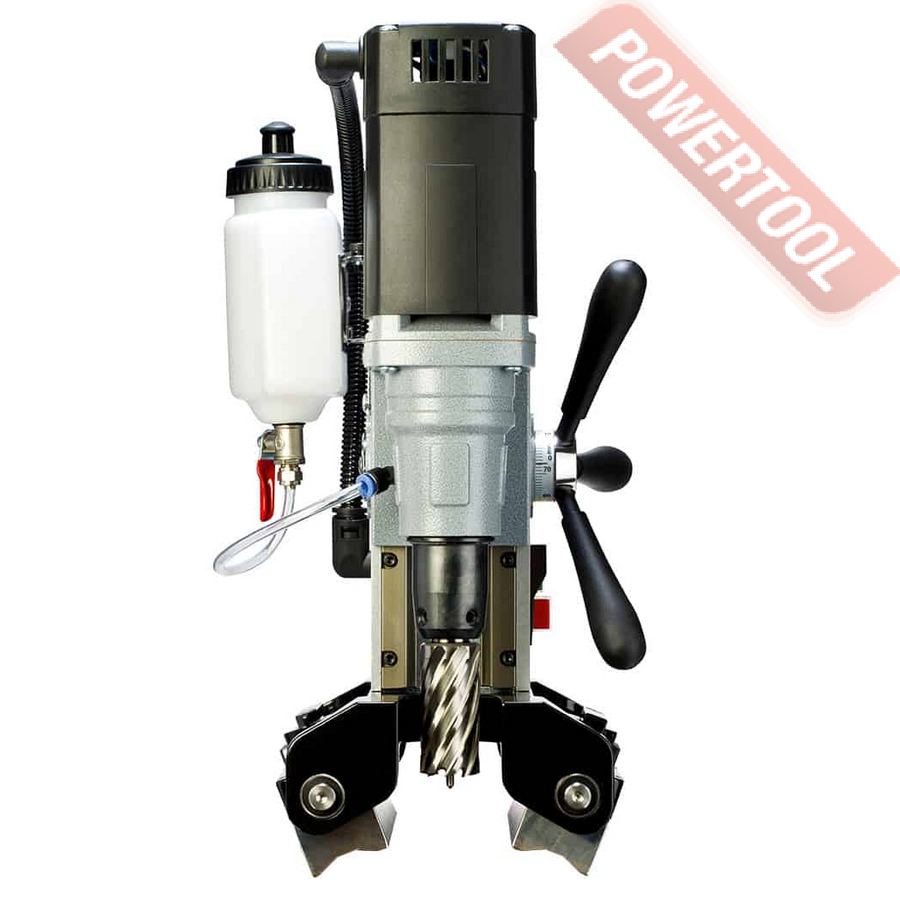 Магнитный сверлильный станок, 900 Вт, 220 В, max диаметр корончатого сверла 35 мм, max диаметр спирального сверла 13 мм, крепление корончатого сверла на Weldon 19, ход шпинделя 90 мм, частота вращения шпинделя 775 об/мин, 1 скорость, прижимная сила 5217 Н, размер магнитного основания ДхШ 187х165 мм, габариты ДхШхВ 275х185х416 мм, вес 10,3 кг, система подачи СОЖ, возможность фиксации на трубах, в комплекте система СОЖ, рукоятки 3 шт, набор шестигранных ключей 2.5, 3, 4, 5 мм, центровочный штифт, кейс.
