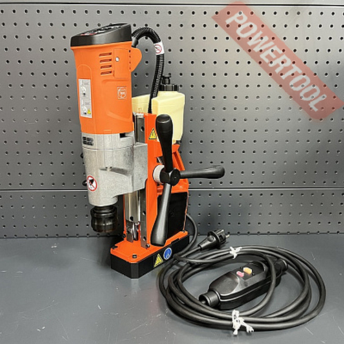 Магнитный сверлильный станок FEIN KBU 35 QW - односкоростной магнитный станок для сверления корончатым сверлом по металлу диаметром до 35 мм и спиральным до 16 мм. Хвостовик 3/4 Weldon (19 мм). Максимальный диаметр зенковки 31 мм. Нарезание резьбы до М14. Величина хода каретки 135 мм (полный диапазон хода 260 мм). Встроенный бачок для СОЖ. Установка рукояти подачи сверла с любой стороны. Компактный и легкий станок. Оптимальное соотношение цены и качества.