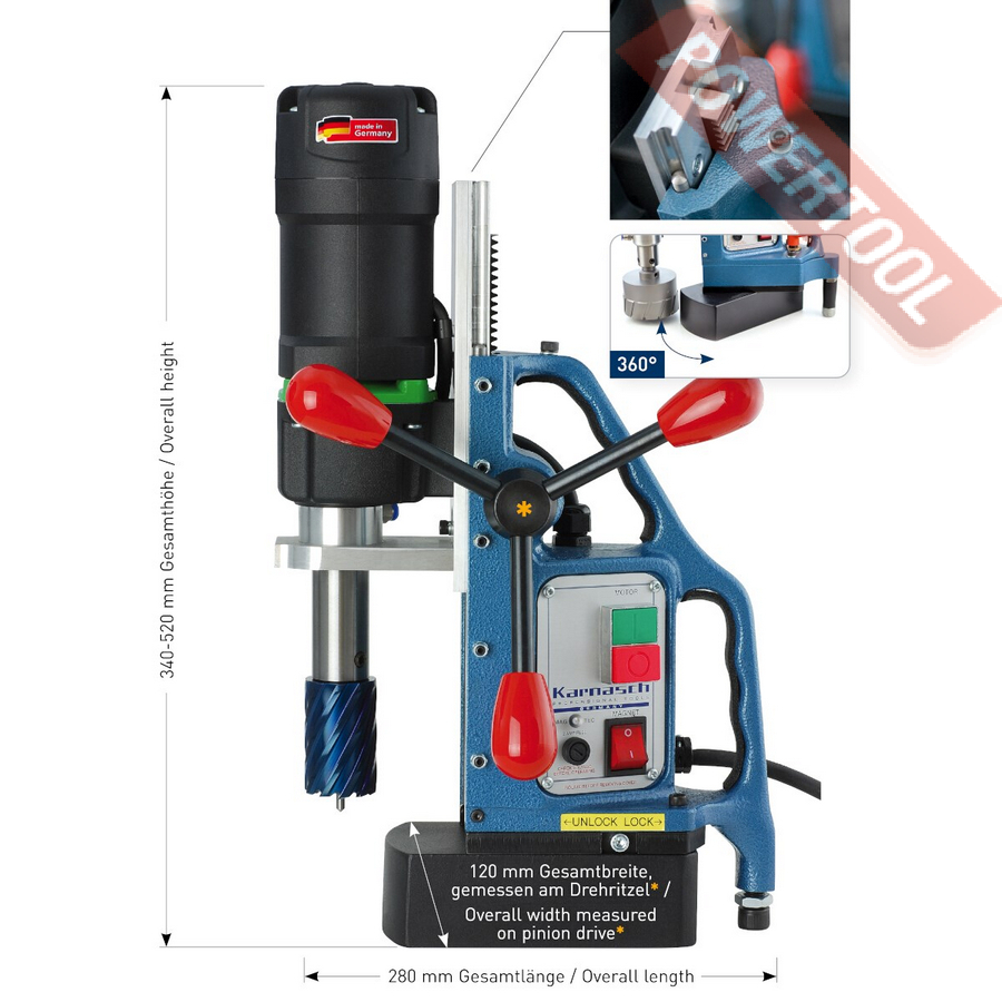 Магнитный сверлильный станок KARNASCH KAS 40 Blue-Mag оснащенный системой двойных рельсовых направляющих, которая рассчитана на большую нагрузку с глубиной сверления до 110 мм. Максимальная глубина резания составляет 55 мм. При использовании штифтов выталкивателя, состоящих из двух частей, возможна глубина резания до 110 мм от диаметра 18 мм. Подвижное магнитное основание.