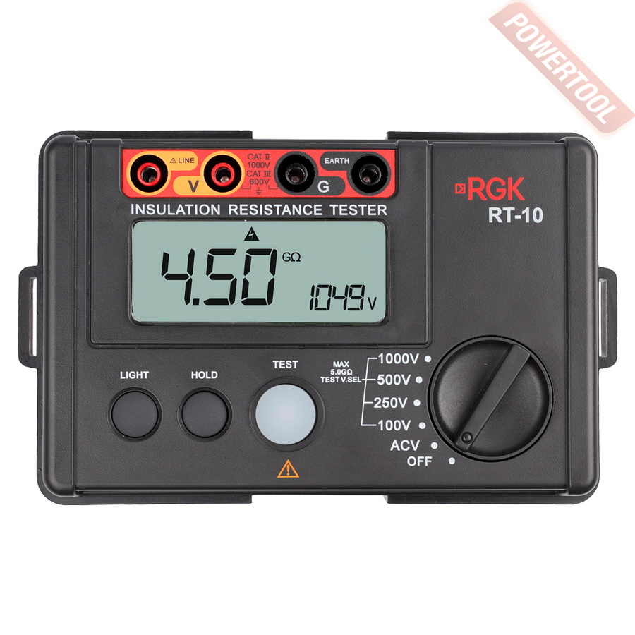 Измеритель сопротивления изоляции RGK RT-10 с поверкой подает на кабель тестовое напряжение - 100, 250, 500 или 1000 В. Специалист выбирает напряжение в зависимости от расчетного, предположительного значения сопротивления исправного проводника. Так, например, в максимальном режиме можно проводить исследования в диапазоне от 100 МОм до 5 ГОм. По итогу определяется утечка тока и значение сопротивления изоляции между двумя точками.