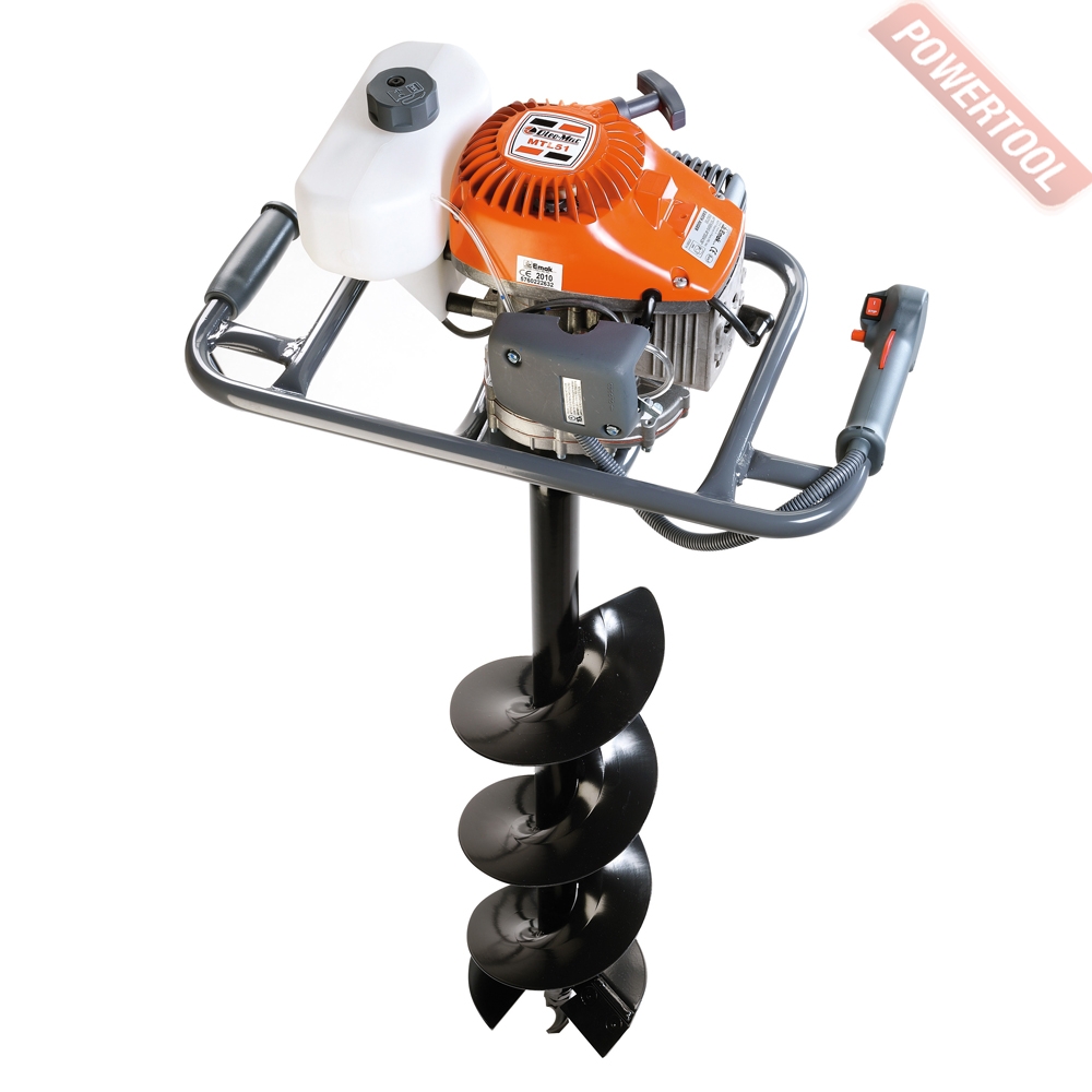 • Рабочей частью агрегата является винтообразный бур или шнек, который приводится во вращение с помощью двухтактного бензинового двигателя.