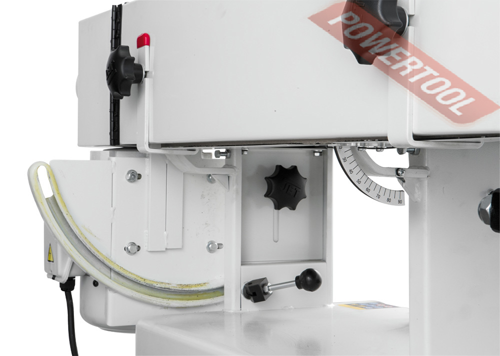 Ленточный узел станка выполнен поворотным вокруг продольной оси, его можно установить вертикально, горизонтально или под любым промежуточным углом, фиксация выбранного положения производится эксцентриковой рукояткой без использования инструмента. Основной рабочий стол, сделанный из литого чугуна, регулируется по высоте, что позволяет выровнять его поверхность с плоскостью ленты при её горизонтальном положении или использовать ресурс всей её ширины при эксплуатации в вертикальном. Для фиксации заготовки предусмотрены длинный «параллельный» упор с фиксацией в Т-образном пазу и подвижный угловой.