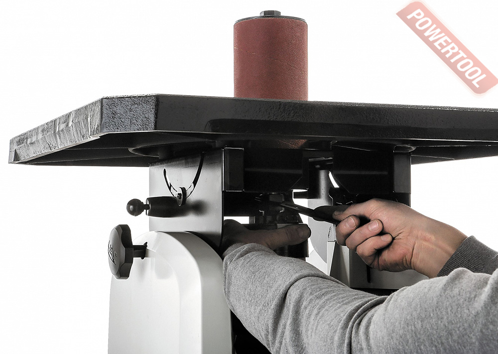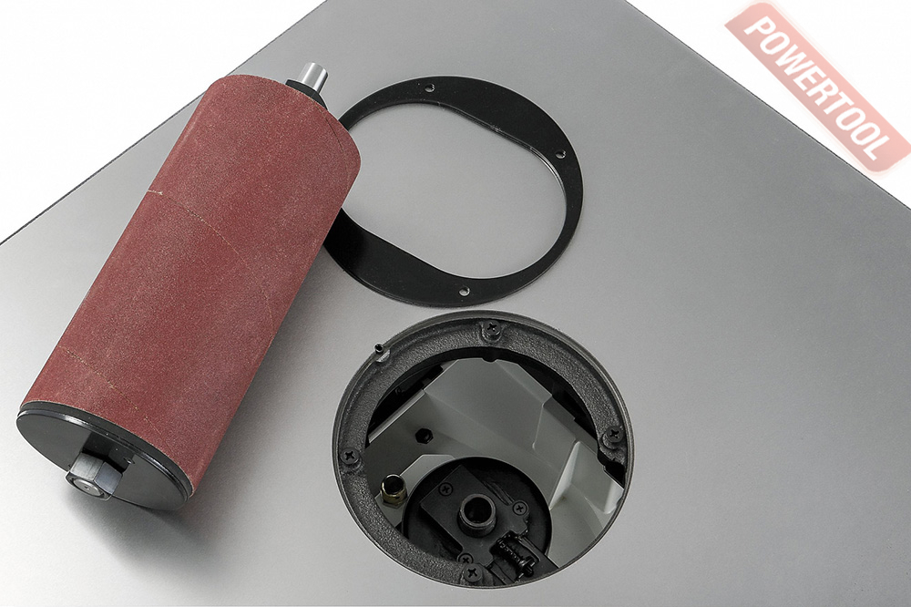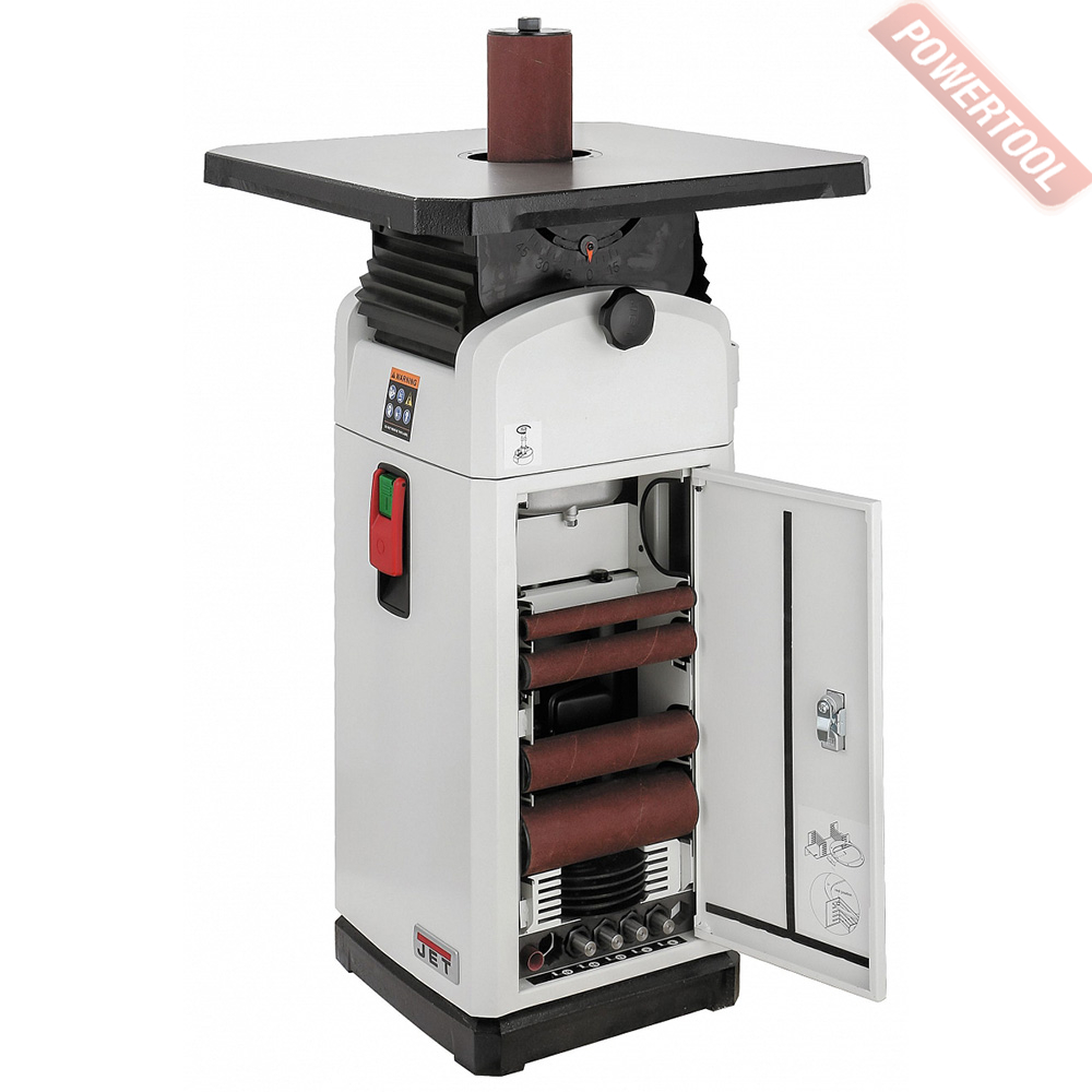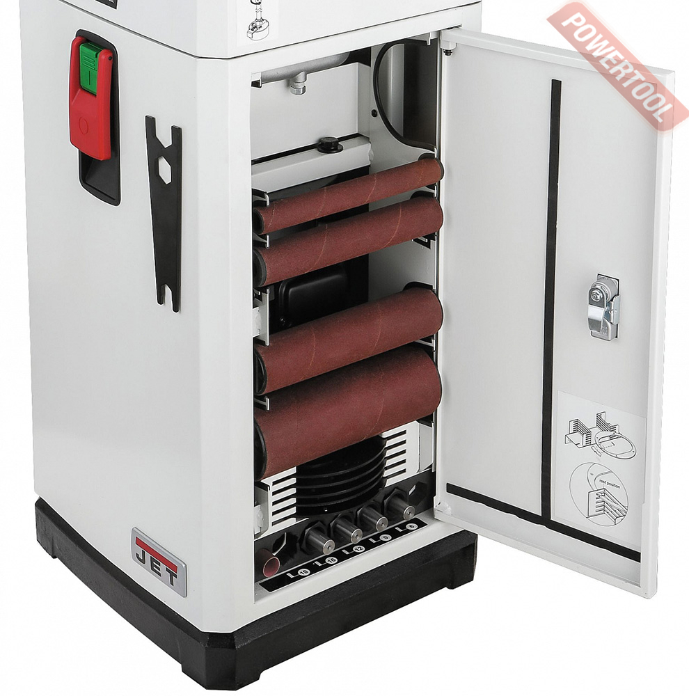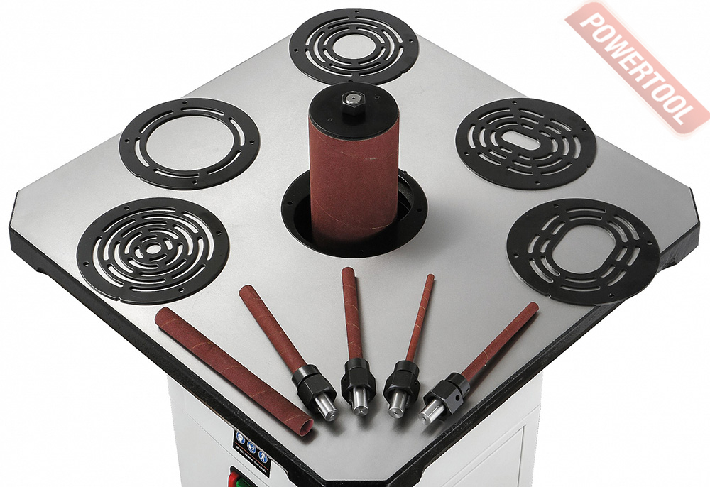 Стандартная комплектация включает в себя 10 шлифовальных шпинделей с диаметром от 6 до 100 миллиметров, а также кольцевые вставки в рабочий стол с круглым и овальным отверстием (для работы в наклонном положении стола). Расходный материал – абразивные гильзы – предлагаются со склада Jet в широком ассортименте.
