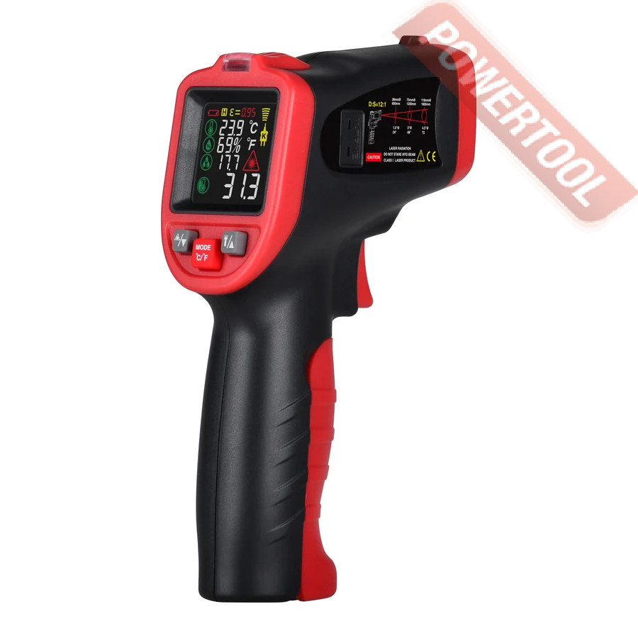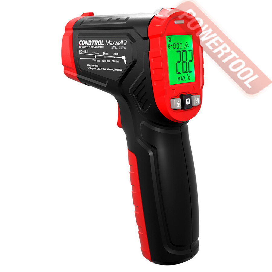 Бесконтактный инфракрасный термометр, диапазон от - 50 С до 750 градусов С, точность 3 градуса С при Т от -50 до 0 градуса С, 1,5 градуса С при Т от 0 до 100 градусов С, 1,5 процента при Т более 100 градусов С, оптическое разрешение 12 к 1, коэффициент теплового излучения регулируемый от 0,1 до 1, температурное разрешение 0,1 градус С, время отклика 0,5 с, многоточечный лазерный целеуказатель, измерение максимальной, минимальной, разницы между ними и средней температуры, звуковая и визуальная сигнализация при превышении максимального и минимального заданного уровня, память 30 ячеек, сохранение измеренного значения на дисплее, спектральная чувствительность от 5 до 14 мкм, дисплей цветной с подсветкой, выбор единиц измерения C/F, питание от батареи 9 В тип Крона, автоотключение через 10 с, вес 0,23 кг.