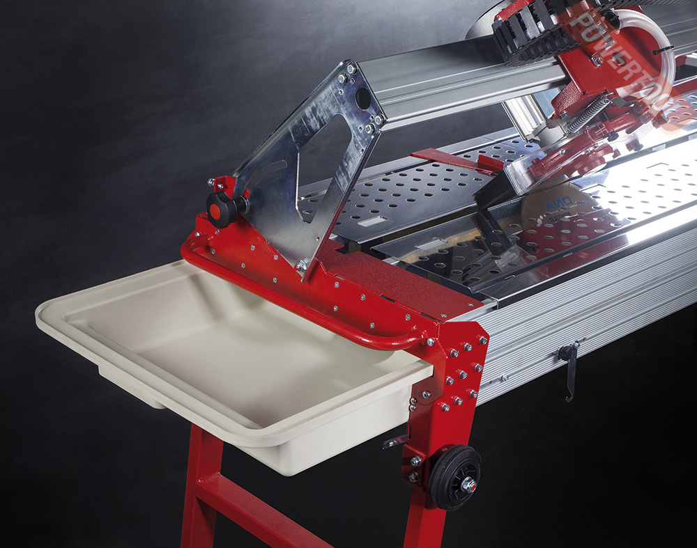 - Ножки плиткореза складываются и имеют колеса для удобства хранения и транспортировки. Помимо этого складные ножки плиткореза позволяют устанавливать станок на любом грунте. Это также позволяет избежать повреждение плиткореза и, как следствие, помогает достичь наилучших разрезов плитки в любом контексте (особенно, когда речь идет о специальных операциях, таких как снятие фаски).