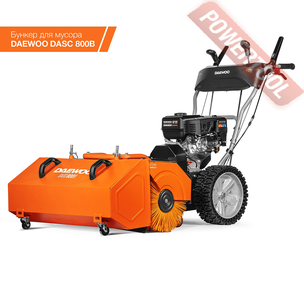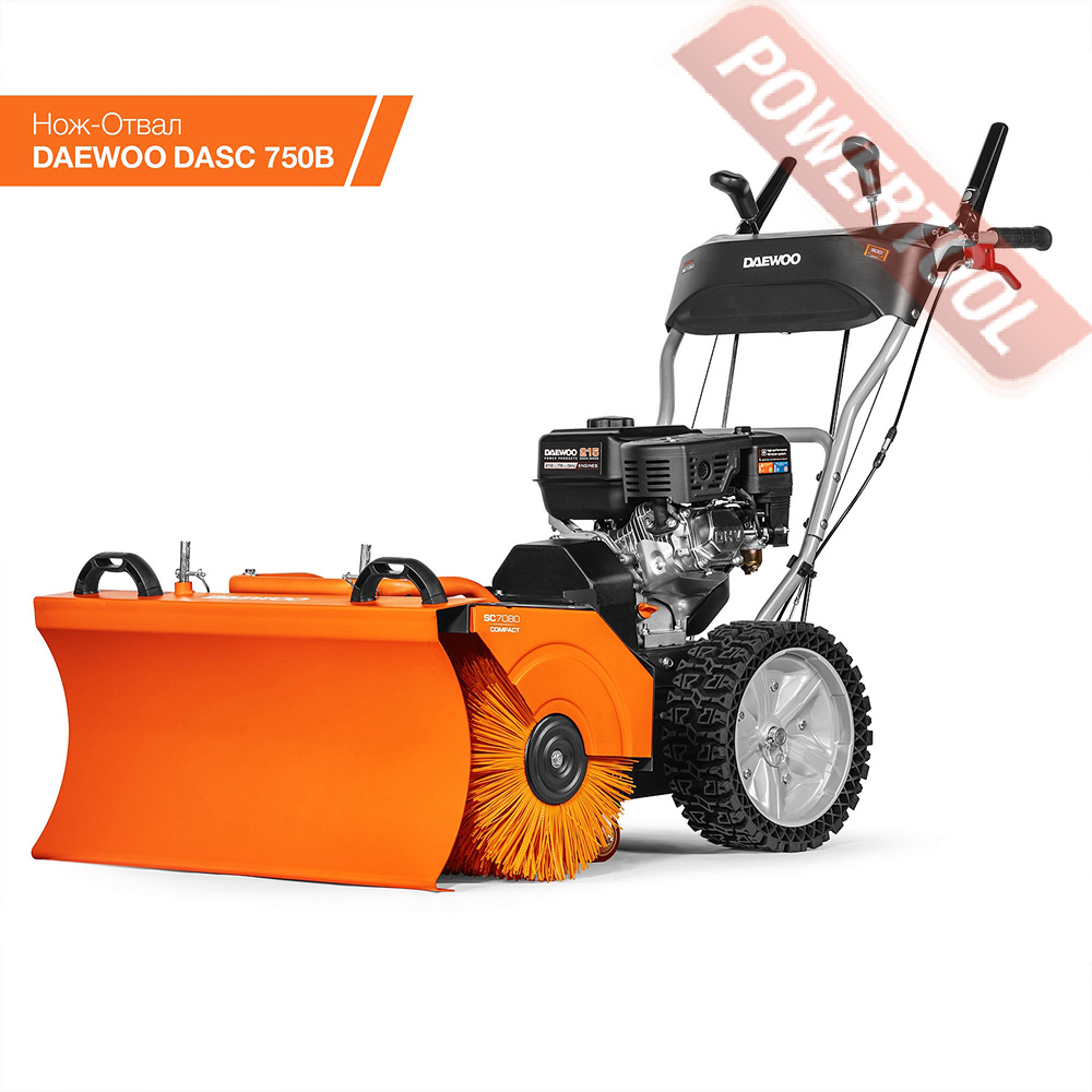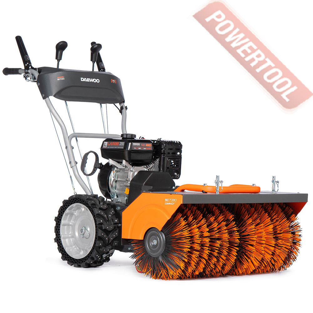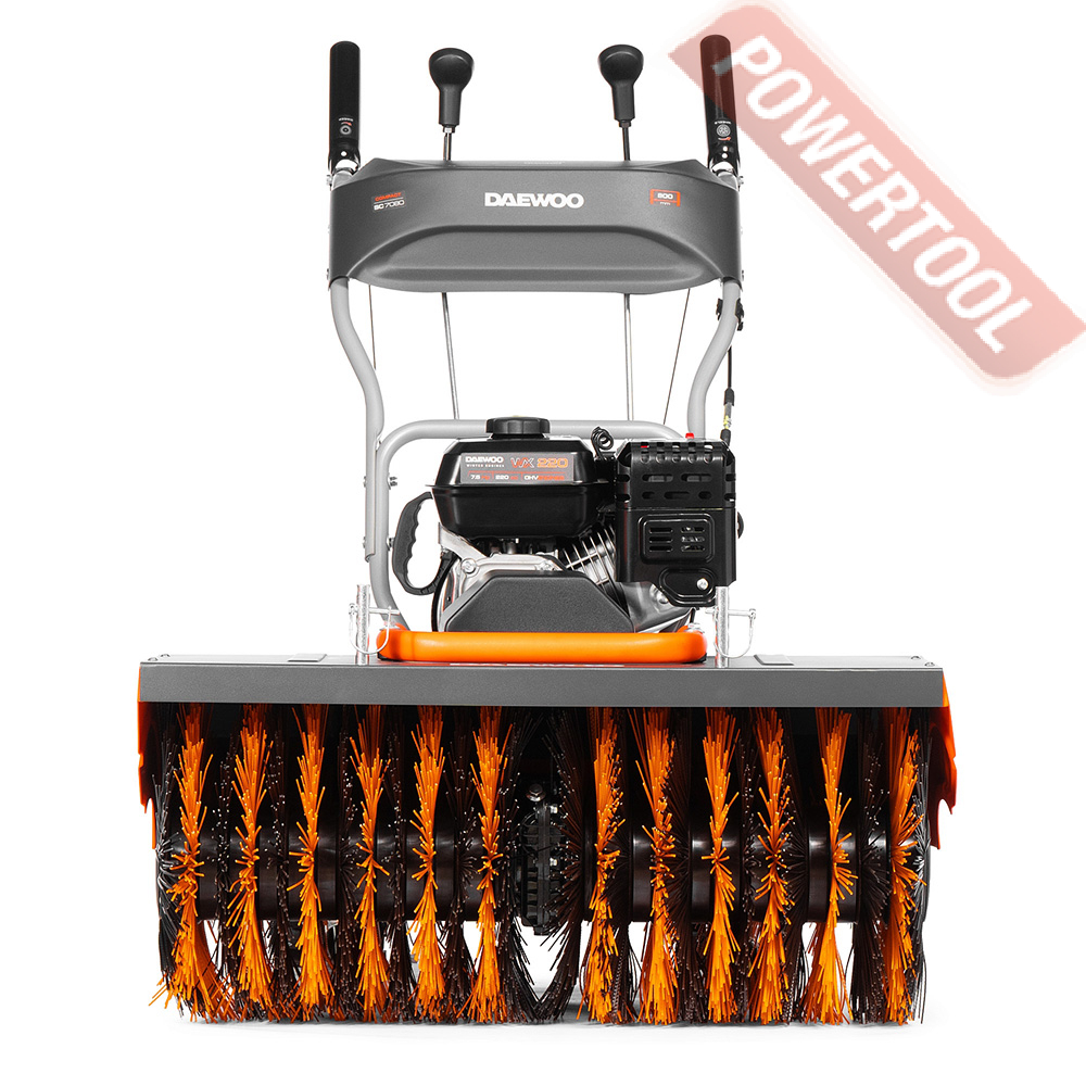 Самоходная щеточная подметальная машина, ширина щетки 80 см, диаметр щетки 34,5 см, скорости 6 вперед и 2 назад, фрикционный диск, 4-х тактный бензиновый двигатель Daewoo 215 snow объемом 212 куб.см и мощностью 7,5 л.с, топливный бак 4,5 л, емкость картера 0,6 л, три позиции направления щетки, регулировка щетки по высоте, колеса 33х10 см, размеры 1050х850х630 мм, вес 79 кг.