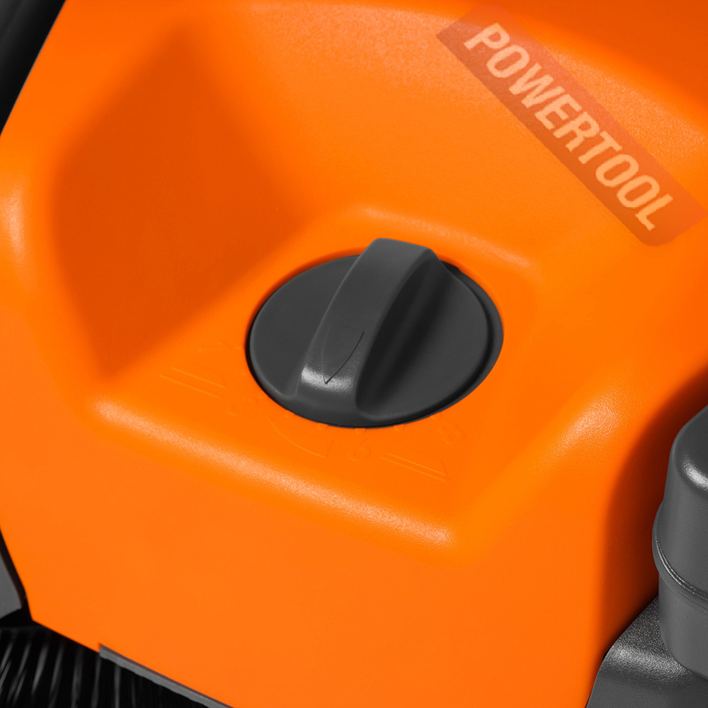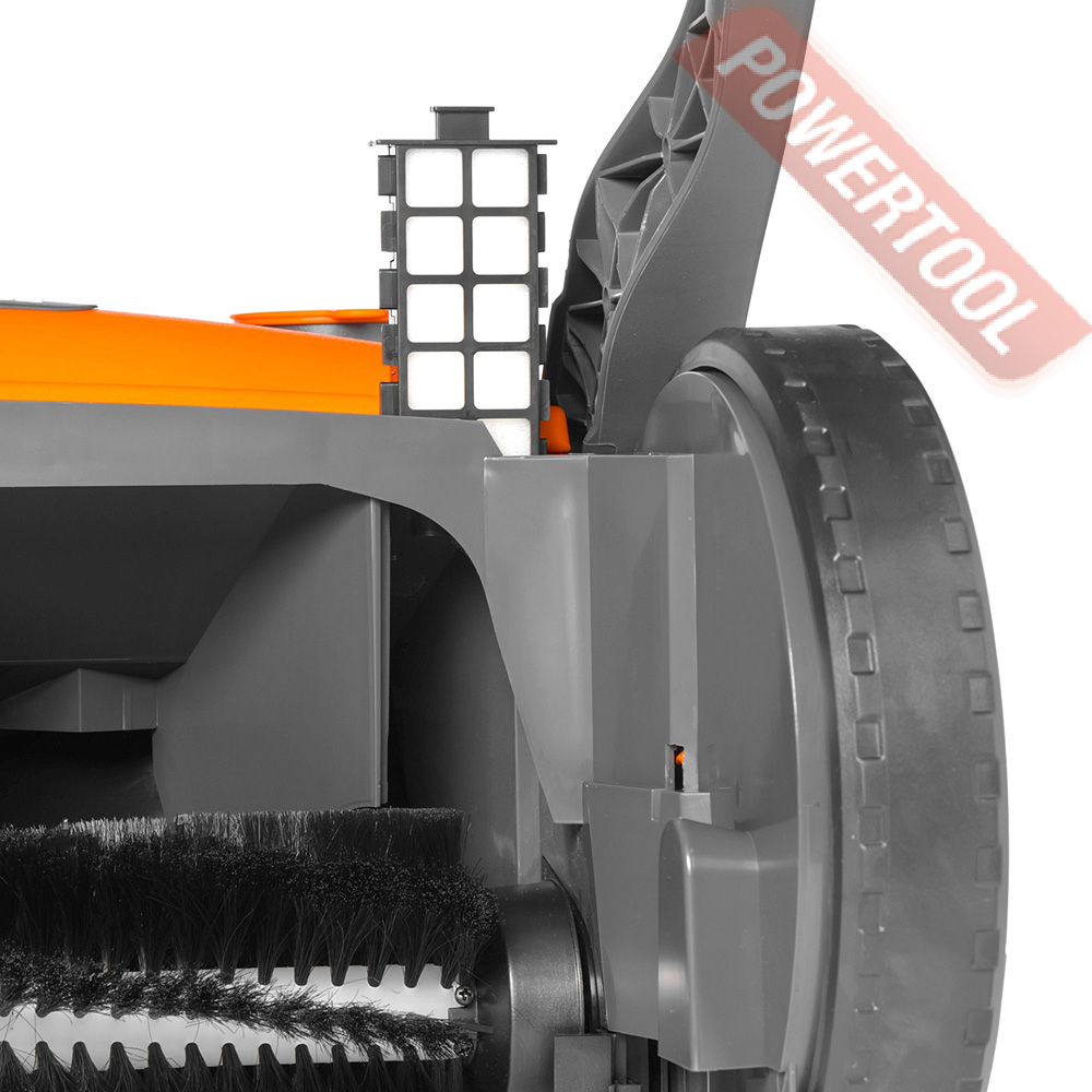 - Бак увеличенного объема 50 л. Позволяет собирать больше мусора и пыли без частых остановок для его опустошения, существенно увеличивая продолжительность непрерывной работы.