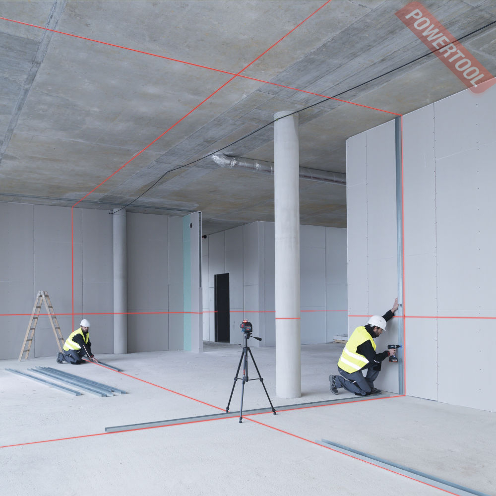 - Построение лазерных линий. Безграничные возможности применения: одна горизонтальная и две вертикальных линии в диапазоне 360 градусов обеспечивают разнообразное применение этого инструмента, например для выполнения одновременной маркировки, выравнивания и нивелирования внутри помещений.