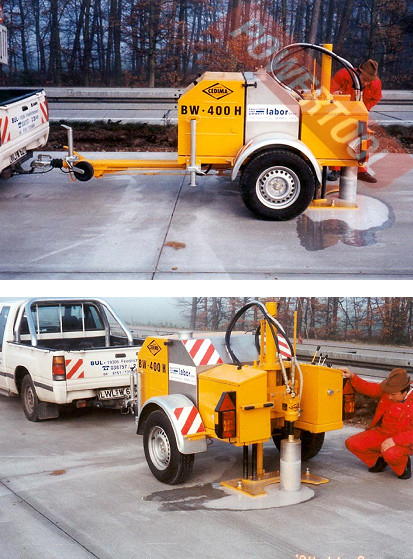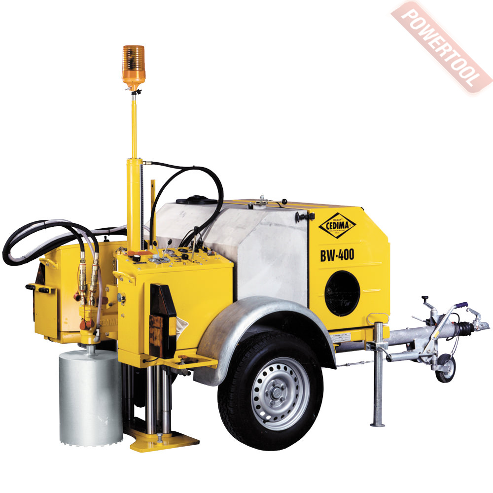 Установка алмазного бурения с прицепом CEDIMA BW-400 H применяется для отбора кернов дорожного покрытия взлетно-посадочной полосы и сверления отверстий под установку наземной аппаратуры освещения. Прицеп оборудован дизельным двигателем Hatz 2 G 40 мощностью 15,4 кВт. Управление осуществляется с пульта, который можно установить сзади прицепа с правой или левой стороны. Максимальный диаметр сверления 600 мм. Механизм привода сверлильного шпинделя оснащен 2-х ступенчатой коробкой передач. Для подачи охлаждающей воды на коронку установлен водяной насос с приводом от клиновидного ремня. Емкость водяного бака составляет 300 л. Спереди прицепа установлен ящик для инструментов с баком для гидросистемы.
