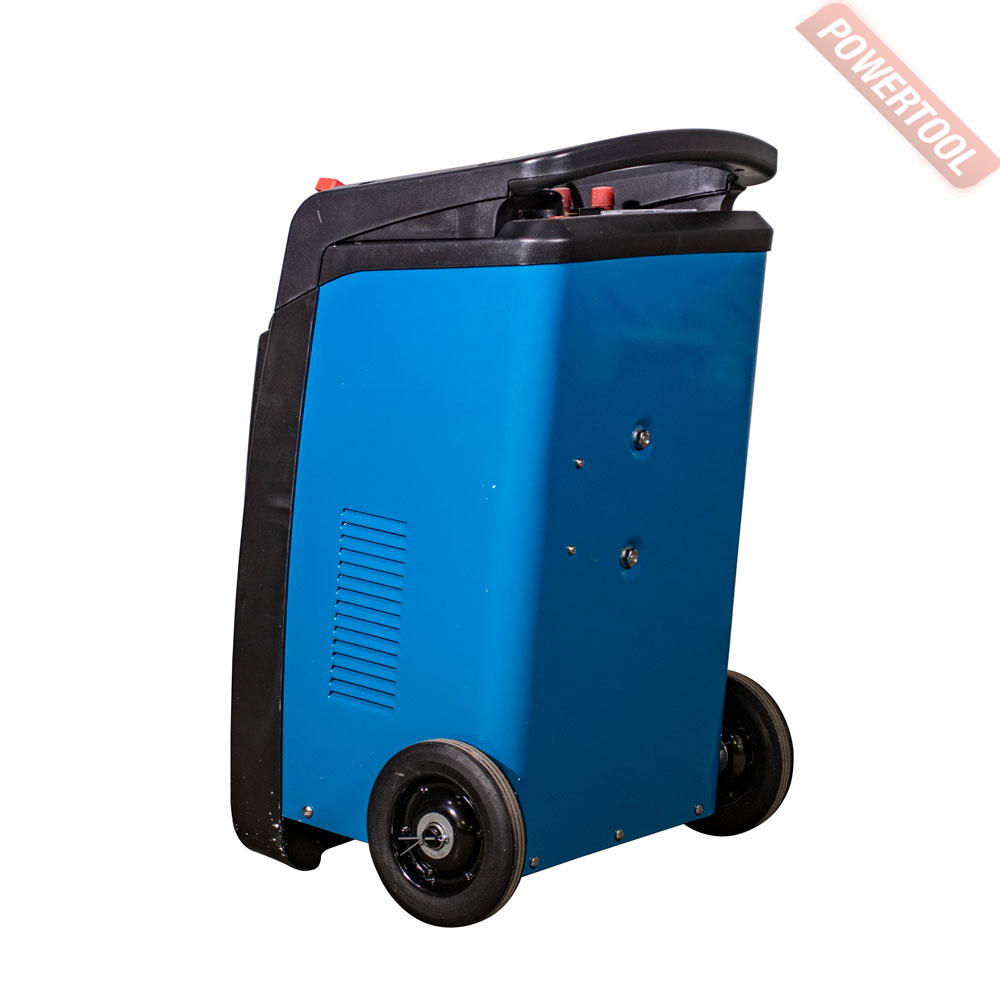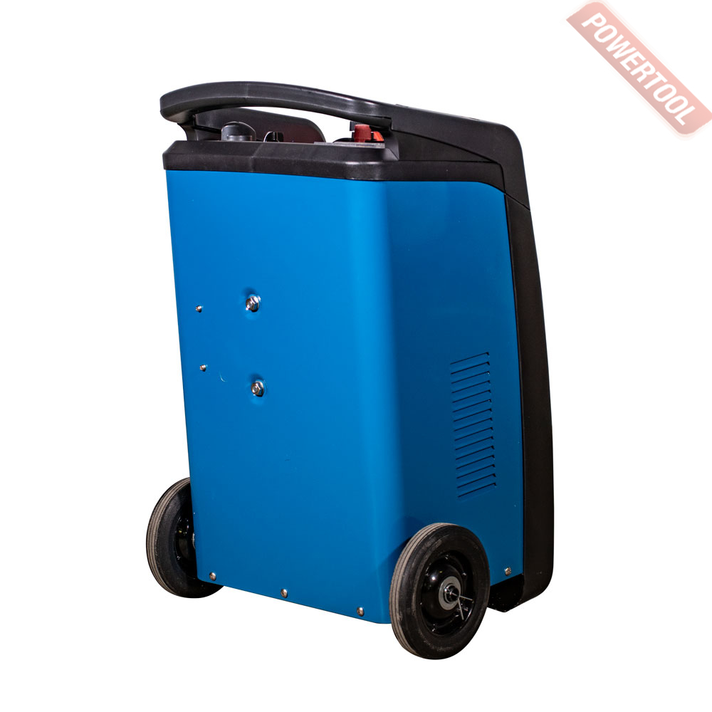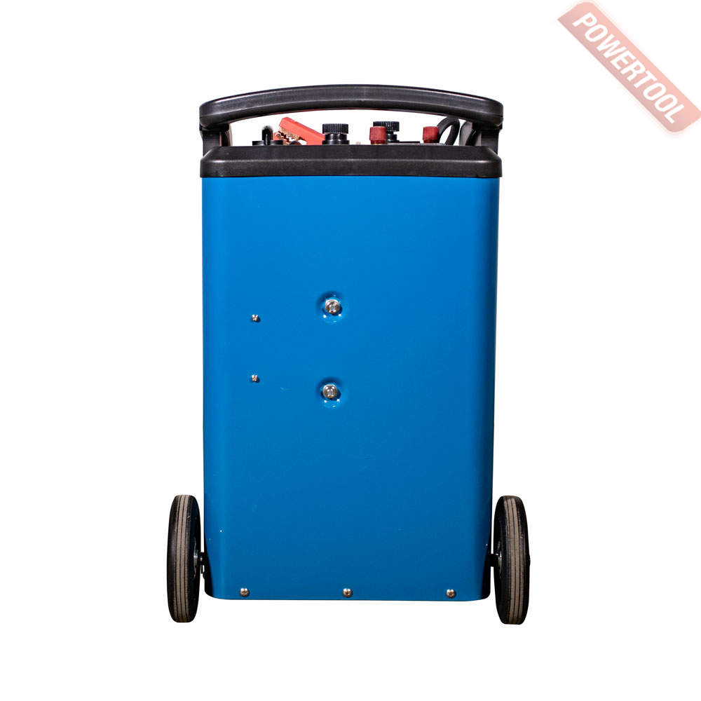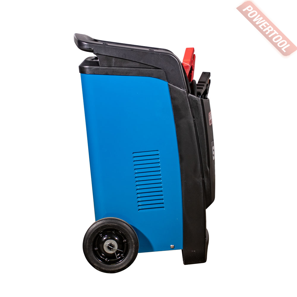 Пусковое и зарядное устройство для автомобилей с 12 / 24 В аккумулятором WET емкостью 20-1200 Ач, стартовый пусковой ток 800 А, 6 режимов тока зарядки до 100 А, однофазное 230 В, таймер зарядки 0-60 мин, мощность зарядка / запуск 2,5 / 20 кВт, амперметр, режим Boost, защита от перегрузки, замыкания, изменения полярности, пульт ДУ, класс защиты IP20, размеры 430х410х730 мм, вес 28,4 кг, колеса.