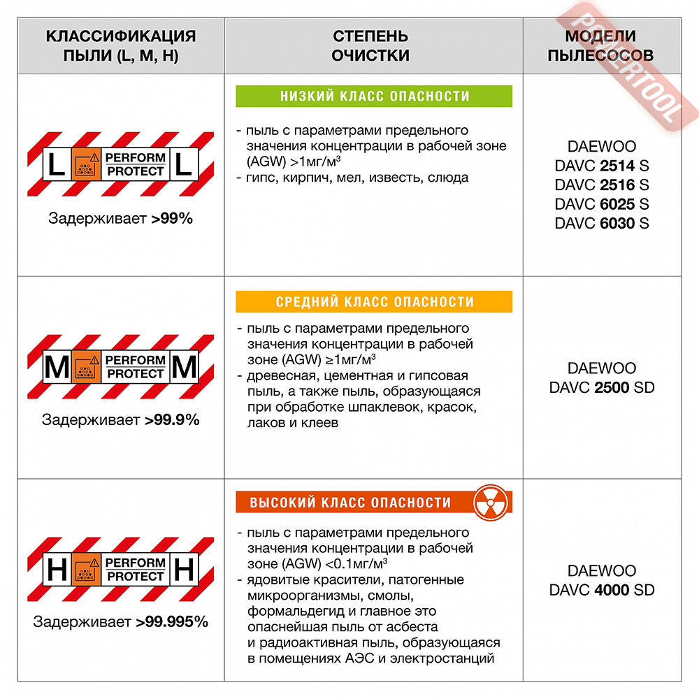 - Система очистки воздуха класса М. Пылесос эффективно удаляет пыль с средней степени опасности, к которой относятся такие вещества как бетон, твердая древесина, керамика, никель, марганец, медная проволока, силикаты, жесть и другие.НЕРА-фильтр класса М применяется для очистки воздуха с эффективностью 99,9 процентов.