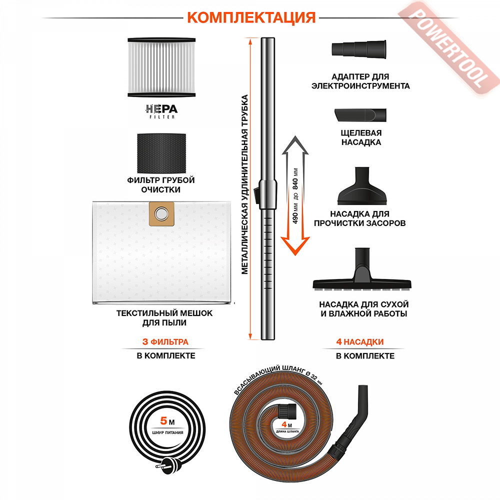 - Шланг увеличенной длины 4 м. Шланг длиной 4 м позволяет собирать строительный мусор на высоте, без необходимости поднимать пылесос.