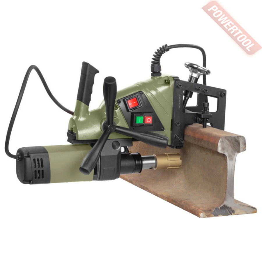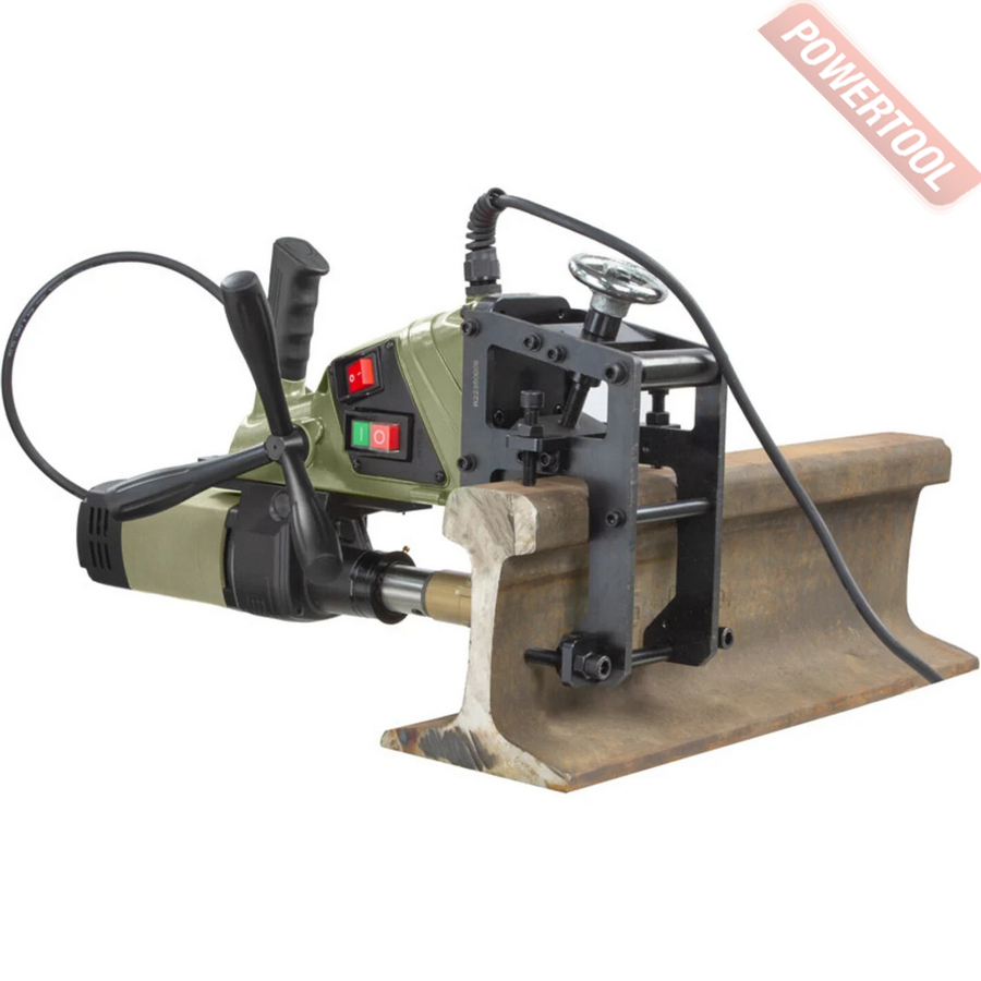 Рельсосверлильный станок, 1100 Вт, 220 В, max диаметр корончатого сверла 35 мм, крепление корончатого сверла на Weldon 19, ход шпинделя 120 мм, частота вращения шпинделя 700 об/мин, 1 скорость, размер ДхШхВ 305х199х633 мм, вес 14 кг, комплект шаблонов P60/65 4 шт, набор шестигранников, манжета сальник 2 шт.