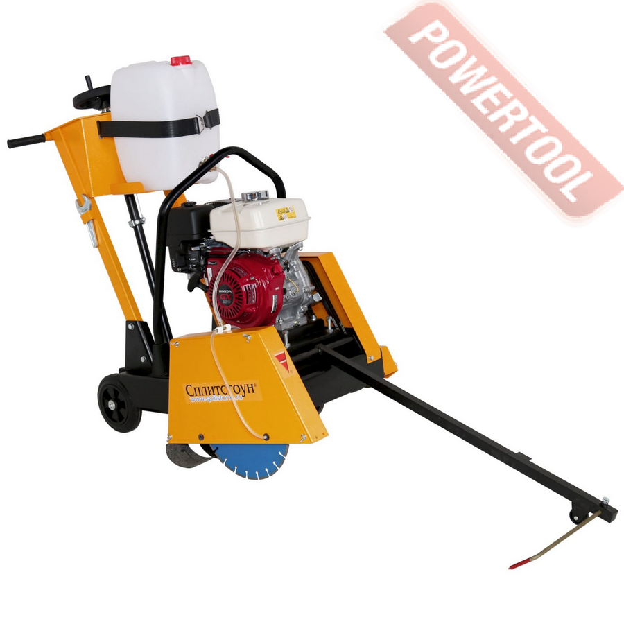 Швонарезчик бензиновый, диаметр диска 350х25,4 мм, глубина реза 120 мм, диск справа, бак для воды 25 л, регулировка глубины ручным маховиком, указатель линии реза, бензиновый двигатель Honda GX270 мощностью 8 л.с., расход топлива 2,5 л/ч, топливный бак 5,3 л, емкость картера 1,1 л, вес 87 кг.