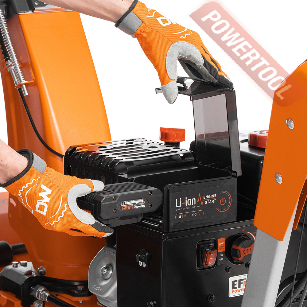 • Электрозапуск от аккумулятора. Благодаря установленному Li-ion аккумулятору на 21В, двигатель запускается простым нажатием кнопки на рукоятке управления. Обеспечивает легкий запуск холодного двигателя при любых температурах до -30 градусов C.