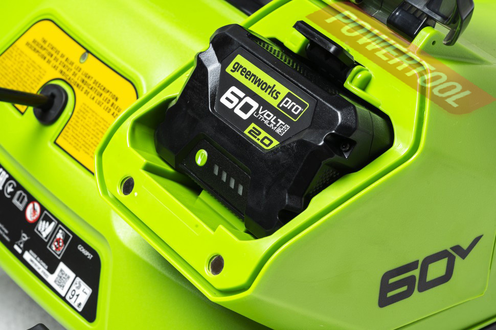 - Работает от аккумуляторной батареи G-MAX 60V, которую можно использовать с другими с устройствами Greenworks из линейки 60 вольт.