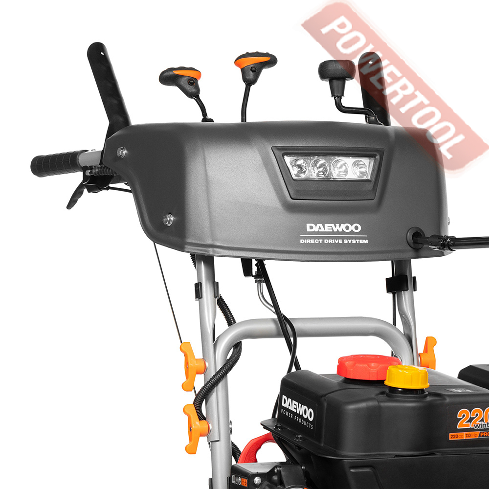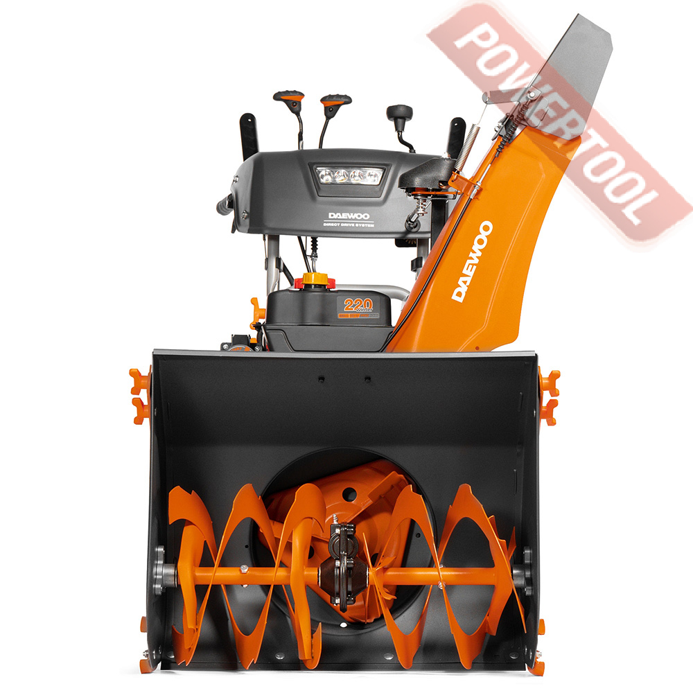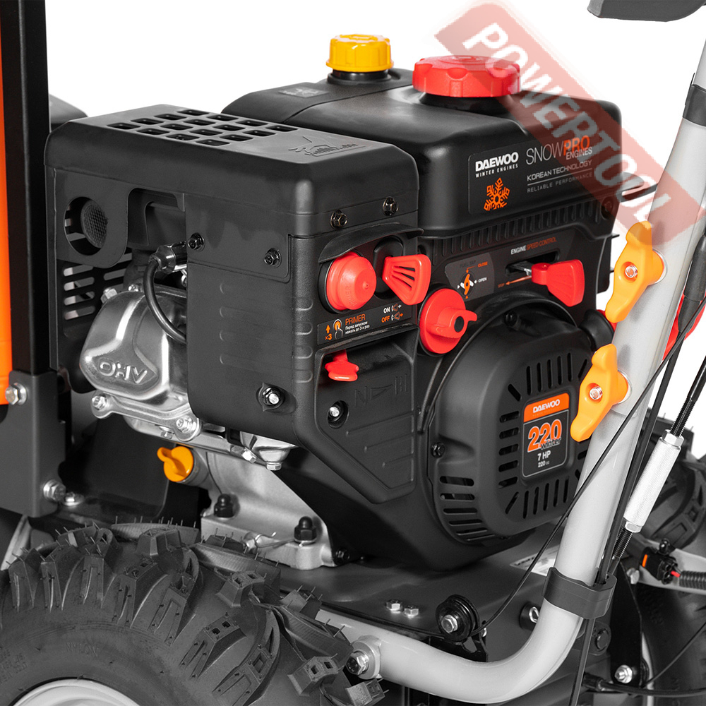 Снегоуборщик колесный самоходный, ширина ковша 60 см, высота ковша 52 см, скорости 6 вперед и 2 назад, выбор направления и дальности выброса снега рукоятками с панели оператора, угол поворота желоба 200 градусов, дальность выброса достигает до 13 м, материал желоба сталь, управление одной рукой, разблокировка дифференциала двумя курками под каждой рукояткой, подогрев рукояток, LED фара, защита от ржавчины ZN+, колеса X?Track, 4-тактный бензиновый двигатель DAEWOO 220 Winter объемом 220 куб.см и мощностью 7 л.с., электростартер от сети 220 В, топливный бак 3,2 л, объем картера 0,6 л, размеры упаковки 1120х700х790 мм, вес 93 кг.