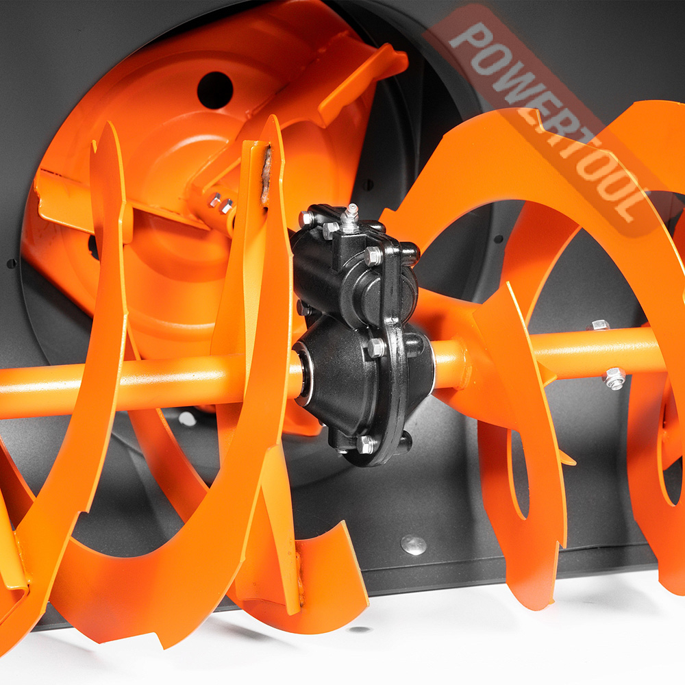 • Усиленный редуктор. Усиленный редуктор в паре со стальными опорами шнека с подшипниками передает до 95 процентов крутящего момента на рабочие узлы сборки и выброса снега. Выходной вал редуктора крепится на подшипниках большого диаметра, что обеспечивает высокую устойчивость механизмов к вибрации и ударам.