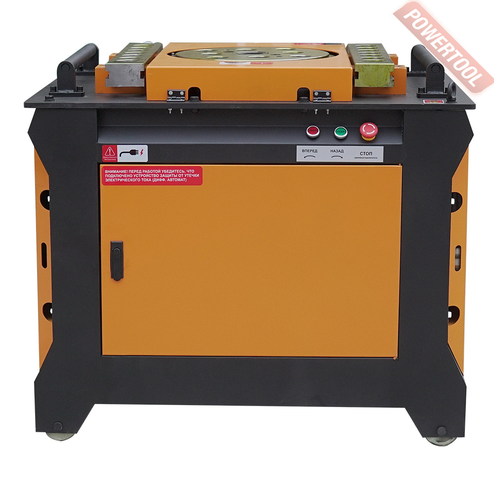 Станок для гибки арматуры, диаметр арматуры min/мах 6/45 мм, трехфазный электродвигатель 380 В мощность 4 кВт, автоматический режимом работы, габариты ДхШхВ 950х740х790 мм, вес 430 кг, педаль, УЗО, штифты, уголок гибочный, гибочные пальцы разных диаметров, втулки разных диаметров.