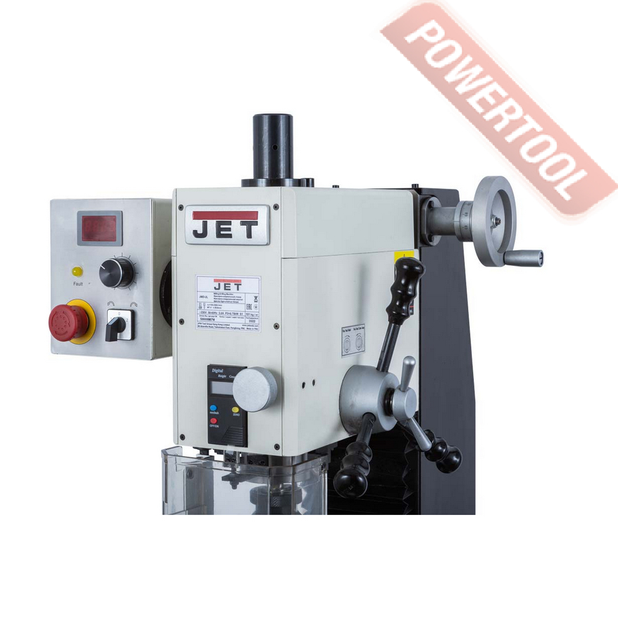 Моторная группа станка JET JMD-2L представлена коллекторным двигателем мощностью 750 Вт. Управление работой двигателя осуществляется с панели управления, расположенного с левой стороны сверлильной головки. Двигатель имеет плавную регулировку частоты вращения. Диапазон частоты вращения составляет 100-2000 об/мин и регулируется потенциометром. Включение реверса осуществляется переключателем стороны вращения шпинделя. Крестовый рабочий стол размером 595х140 мм перемещается по направляющим скольжения типа ласточкин хвост. Закрепление тисков и других зажимных приспособлений осуществляется с помощью 3-х Т-образных пазов размером 12мм и расстоянием между ними 35 мм.