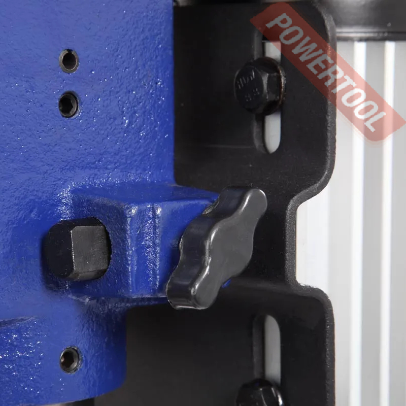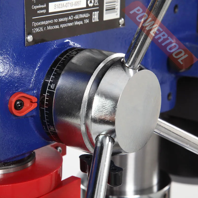 В комплекте предусмотрены тиски. Для их крепления есть по два паза на рабочем столе и на основании. Шкала, расположенная на рукоятке регулировки глубины сверления, показывает ход пиноли шпинделя, с ее помощью можно настраивать ход пиноли, для этого необходимо провернуть шкалу, стрелка на корпусе будет показывать значение, на которое будет возможно погружение сверла, затем затянуть барашек. Наконечники тройной рукояти удобной формы, что способствует плавной подаче сверла к заготовке.